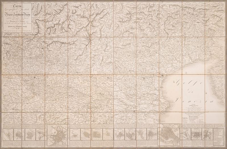 Copper engraving, drawn by Giacomo Pinchetti, under the direction of the geographer and engineer Giovanni Brenna and engraved by the cartographer abbot Giuseppe Pezze, 860 x 1320 mm, divided into 40 panels glued on grey canvas, with the maps of 17 provincial capitals in the lower section, cardboard case.