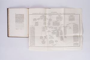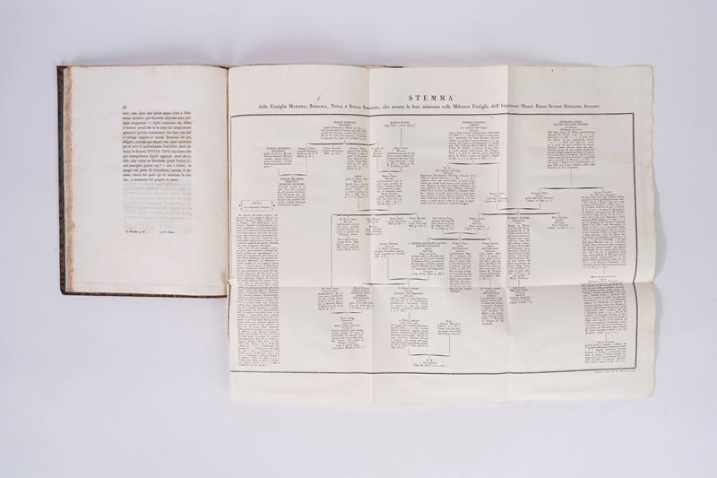 Brescia, Nicolò Bettoni, 1823. In 4°. Engraving vignette on the title page depicting an ancient Roman coin, plate with a folded family tree of several Brescian families, and four copperplate plates at the end of the volume. Contemporary calf binding, covers framed in gold, gold title within a red label on the smooth spine with decorations. Ownership signature on the flyleaf dated Brescia, 1931.