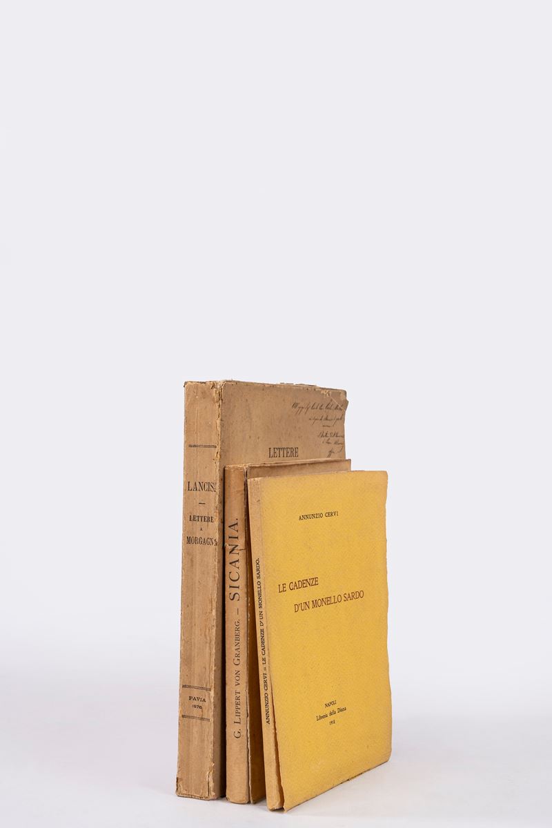 Florence, Barbera, 1899. 8°. Typographical decorations, mostly uncut, light and rare foxing, light even browning, editorial paperback in stiff cardboard, minor defects. Dedication by G. Zuppone-Strani on the flyleaf. § Corradi, A. Letters from Lancisi to Morgagni . Pavia, Stabilimento Tipografico Successori Bizzoni, 1876. With a dedication to Count Cav. Carlo Morbio from the Rector of the University of Pavia on the front cover. § Also in the lot : Cervi, Annunzio, The cadences of a Sardinian rascal , Naples, Libreria della Diana, 1918.