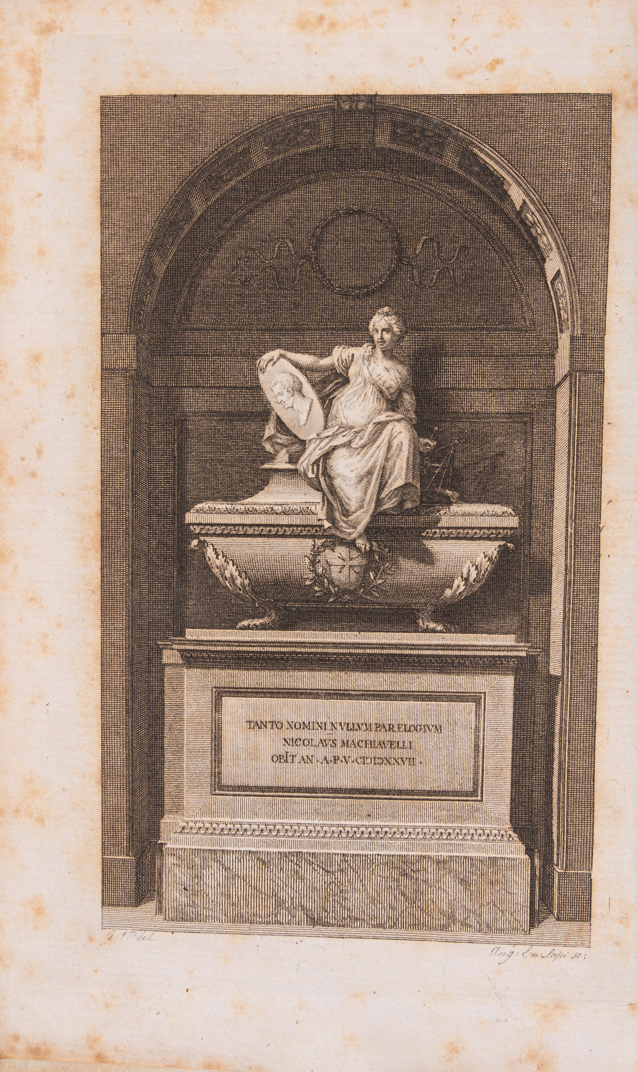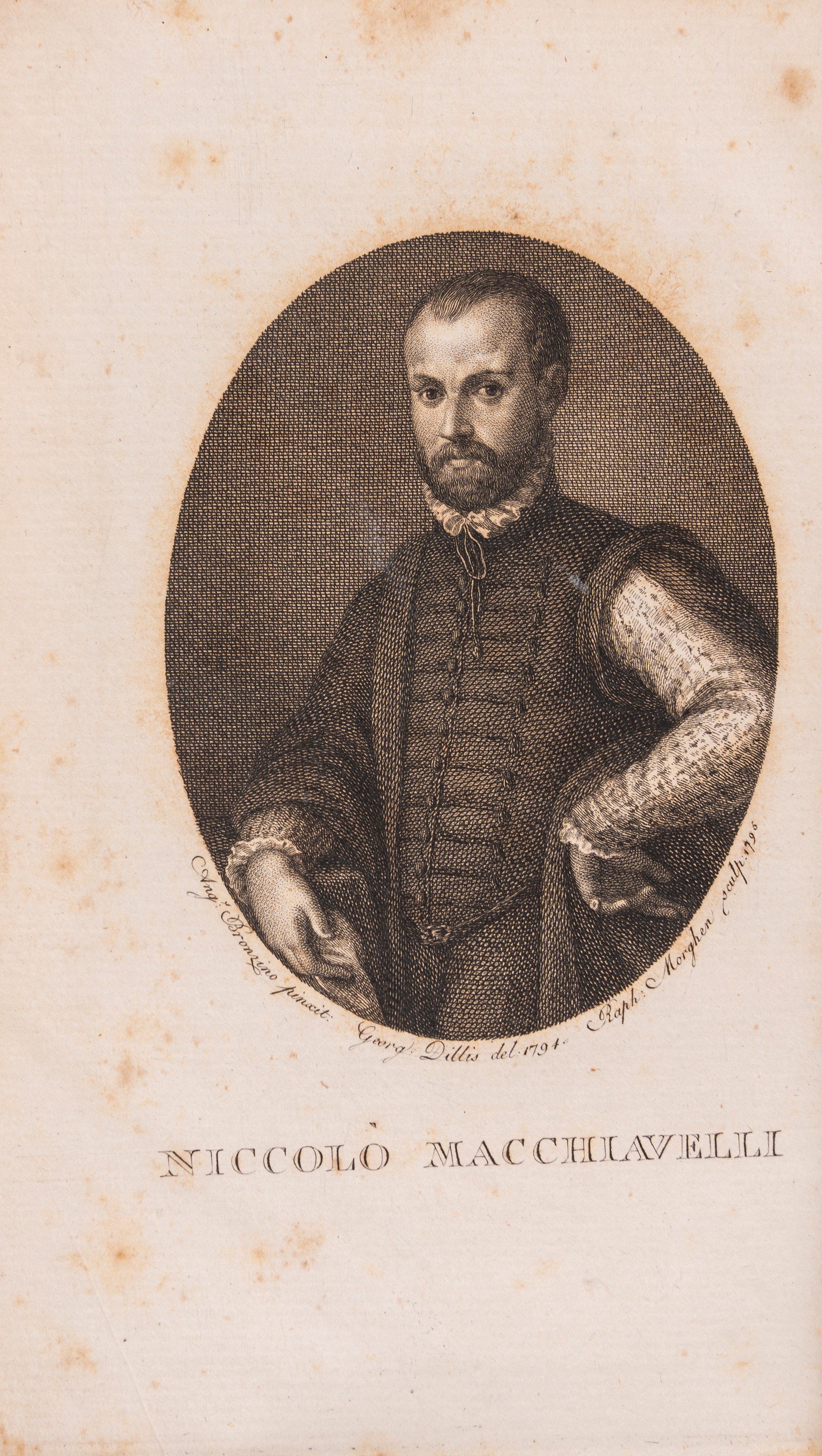 Philadelphia [Livorno], printed by the United Provinces [Tommasi Masi & C.] 1796-97. In 8°. 6 vols. The first volume has a frontispiece with a portrait of the author and a plate depicting Machiavelli's tomb engraved by Raffaello Morghen and Angelo Emilio Lapi, 2 folded plates, all engraved in copper, some sporadic foxing and browning, contemporary full hard parchment binding, titles on double red and green morocco labels on the spine, elegant gold decorations, minor defects and signs of wear.