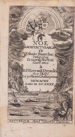 Audomari, Carolus Boscardus, 1619. In-12°; full parchment binding, with manuscript title on the spine, traces of cut bindings, headbands; pp. (18), 501, (30); inc. on the title page with Jesuit brand, inc. initials and end-pieces in wood. Ownership indication on the title page with illegible name and date 1630. Slight browning of the pages due to the normal patina of time; work in very good general condition. § Together in the lot: Pallavicino Ferrante, La rete di Vulcano , In Villafranca [ie: Ginevra], 1660. In-12°, 130x76 mm, 19th century binding in half cloth and marbled paper, with title printed on the spine, ribbon bookmark; pp. [22], 372. Errors in page numbering: p. 101 num. 102, p. 127 no. 167. Woodcut headpieces and initials. Light traces of use on the binding, with marginal abrasions. Reddish interior leaves, some with browning and foxing. Copy in good general condition; § Drexel Jeremias, Noe architectus arcae in Diluuio Nauarchus/Nicetas seu triumphata incontinentia, 1640. In-24°, 110x62 mm, contemporary parchment binding with flaps, manuscript title on the spine, edges dotted in red; two works bound in one volume; copperplate title page; woodcut initial; emblem of the Jesuits on the title page; the last 2 c. blank; beautiful engraved title page and two full-page engravings depicting: Nicetas Victor and Cupido Victus (where Cupid is crucified on a tree and stoned). Ownership inscription and handwritten text on the first front free flyleaf (not legible, but 1667). Slight traces of use on the binding. A damp stain on the lower portion of most leaves. Otherwise, a good copy overall.