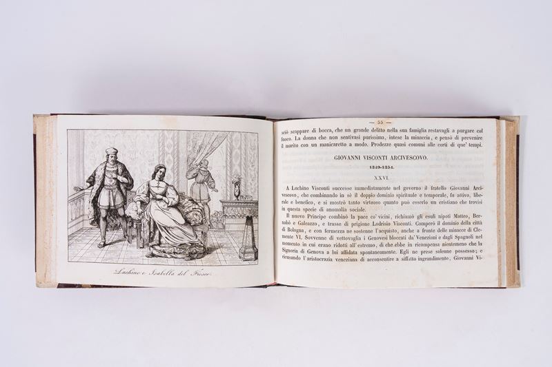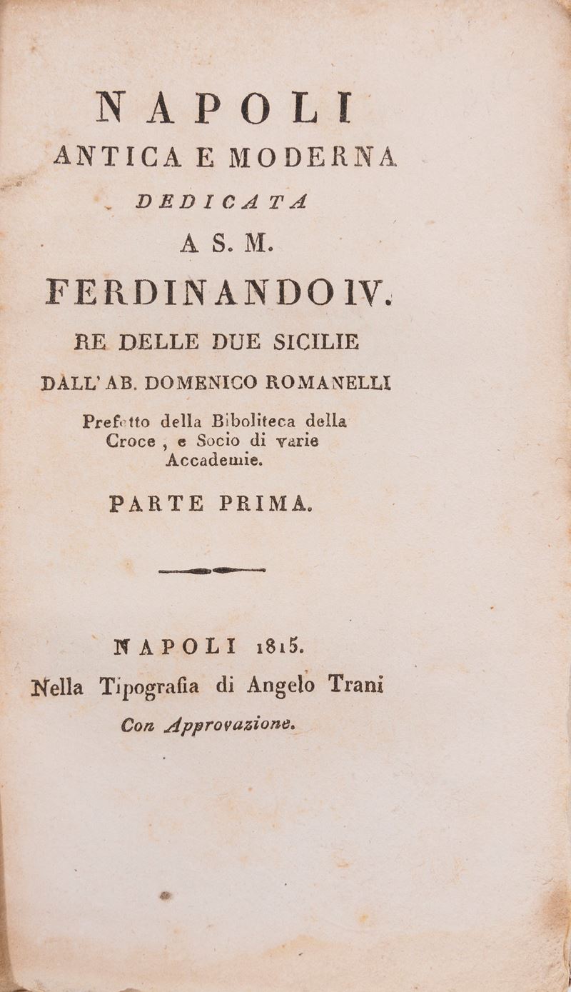 Naples, Angelo Trani Printing House, 1815. In-12°, hardback binding, contemporary edition; 3 vols.; first part (ancient Naples): pp. (8), 182, 2 c. b/w illustrations, folded several times (one between p. 100 and 101, bearing the inscription in the corner of the Nunziata, and one at the bottom, bearing an iconography of Naples and the gulf, both by Cataneo inc.); second part (modern Naples): pp. (4), 5-189, (1 b.); third part (modern Naples): pp. (4), 5-212, 2 c. at the bottom with tables of weights and measures and statistics for the year 1814, repeated in the numbering on pp. 167-168. Work in burls and still with closed sheets. Presence of some damp stains. Complete work in very good general condition. § Together in the lot: Baroni Clemente, The history of Milan narrated to the young men , Milan, From the ancient firm of Pietro and Giuseppe Vallardi (Tip. Pirola), 1870. In-16°, oblong, 132x182 mm, contemporary hardback in half leather and cloth with the covers, illustrated cover with title and coats of arms from the original paperback glued to the front cover and title on a paper shield, also from the original paperback, glued to the spine, edges sprayed in red; engraved frontispiece and 15 full-page engraved steel plates, also outside the text. Work without publication date (1870?). Copy in almost excellent condition.
