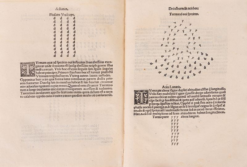 Rome, Eucharius Silber, 1494. In 4°. 4 parts, dated: I) October 24, 1494; II) November 3, 1494; III-IV) undated. Part V, the final 16 cc., containing Onosander, De optimo imperatore (supplied in facsimile), is missing. Decorated woodcut initials, numerous military tactical diagrams in the text of Part IV ( De instruendis aciebus ), an excellent example in an 18th-century half-parchment and marbled cardboard binding. Old ownership note on the second leaf, modern bibliographical notes on the flyleaves.