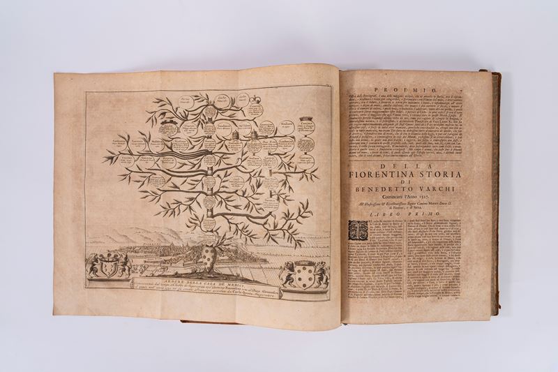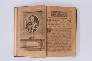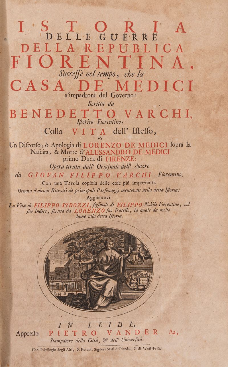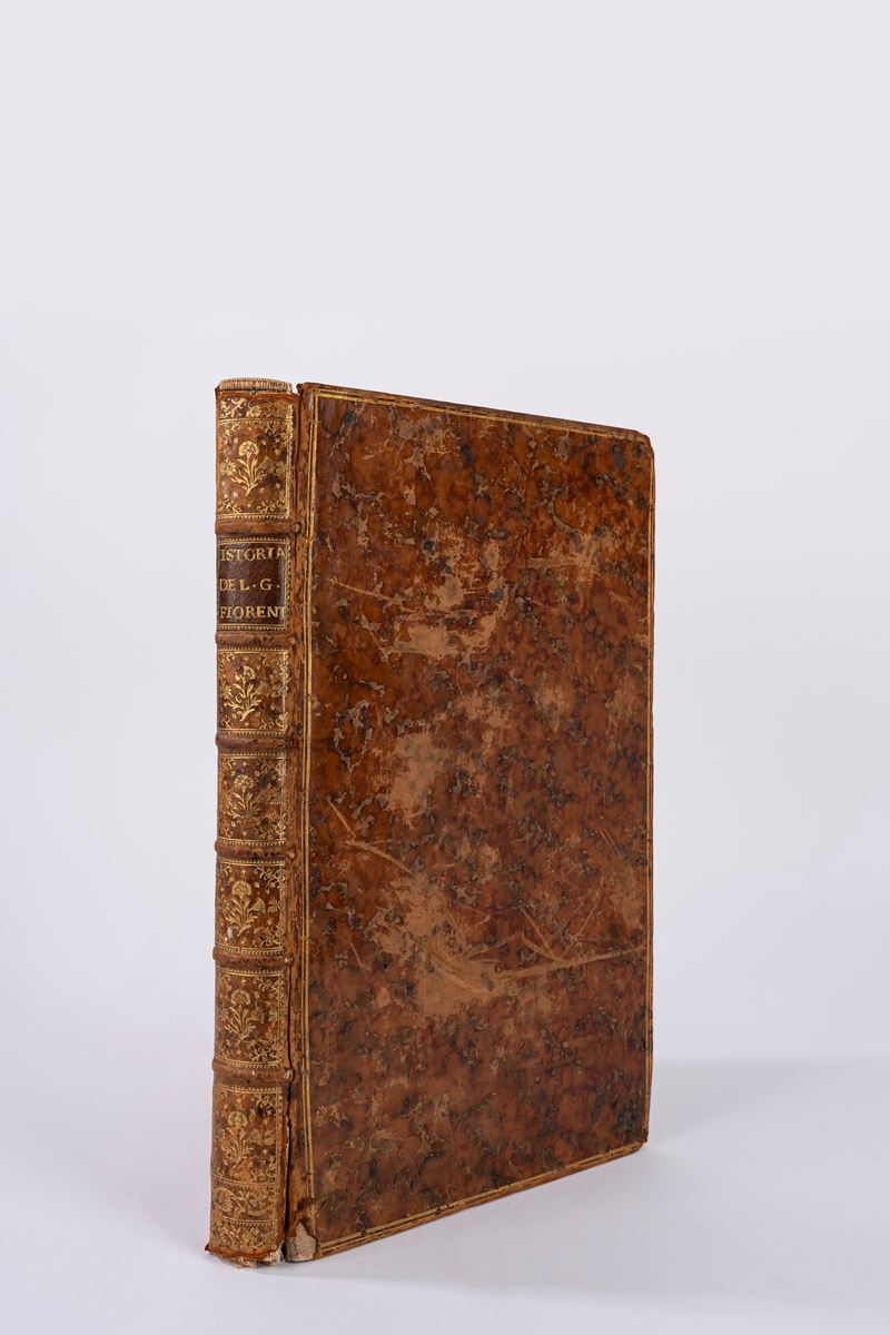 Leiden, by Pietro van der Aa, 1723. In-folio; 18th century binding in full brown leather, marbled on the boards, triple gold fillet frame on the boards, gold titles on a colored label on the spine with six raised bands, phytomorphic frames and friezes on the compartments, marbled edges; two parts in one volume; Title page in red and black letters, intaglio vignette within an oval on the title page, intaglio headpieces, woodcut initials, 8 engraved plates outside the text, and a large folded plate; the plates bear full-page portraits of the Author, Cosimo de' Medici, Giulio Cardinal de' Medici (created by Pope Clement VII), Francisco I, Ipolito de' Medici (Cardinal), Malatesta Baglioni (General of the Florentines), Alessandro de' Medici (First Duke of Florence), and Charles V (Emperor of the Romans). The large folded panel shows the family tree of the Medici family, with a view of Florence in the background.