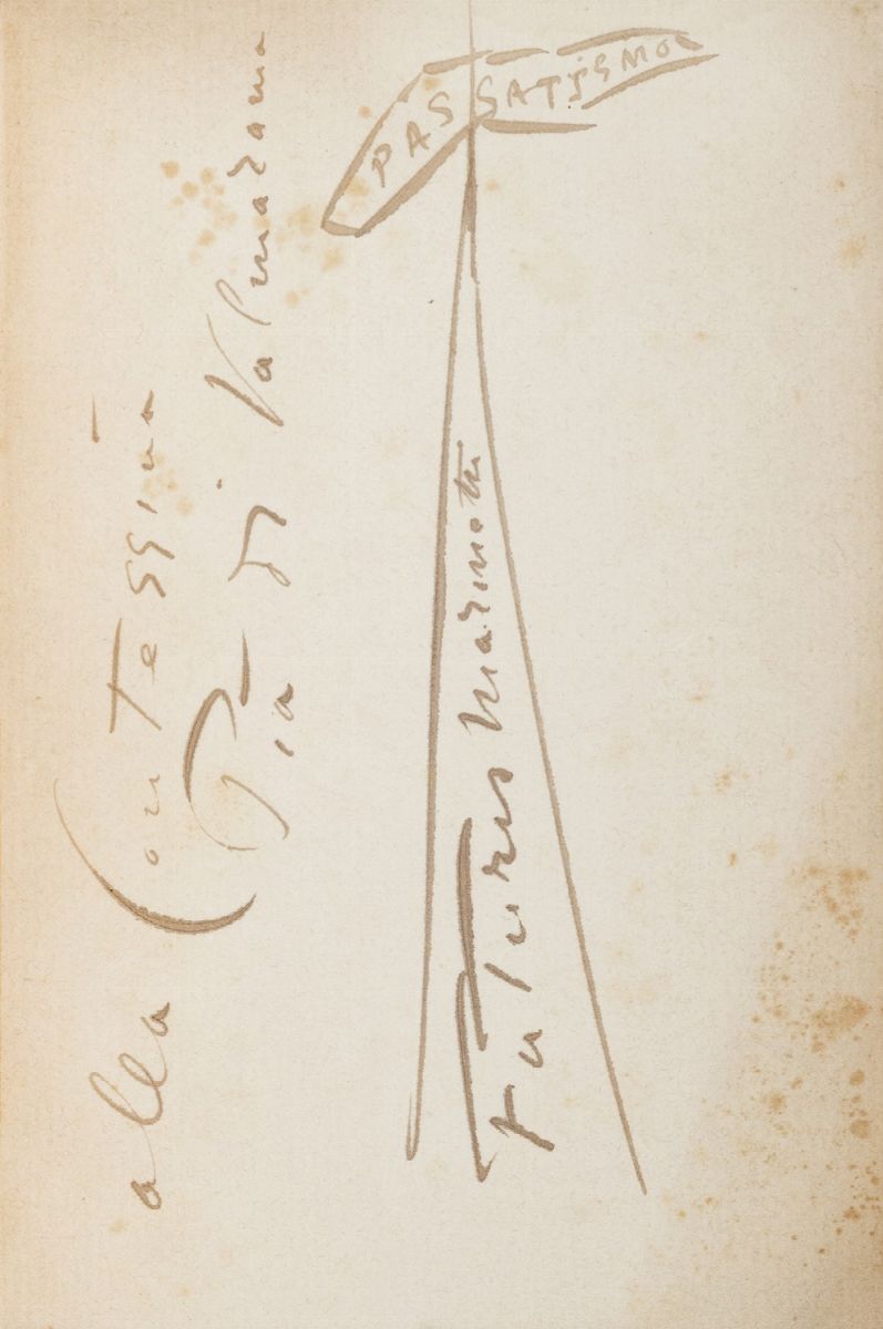 Milano, Edizioni Futuriste di «Poesia» (Stab. Tipo-litografico A. Taveggia), 1914. In 16°. 200 x 140 mm. Fotoritratto dell'autore di Emilio Sommariva, una tavola parolibera "Carta sincrona dei suoni, rumori, colori.." più volte ripiegata dopo p.66, esemplare in barbe, bella dedica al foglio di guardia, brossura editoriale arancione stampata in nero ai piatti e al dorso, con copertina a cura della tipografia Cesare Cavanna.