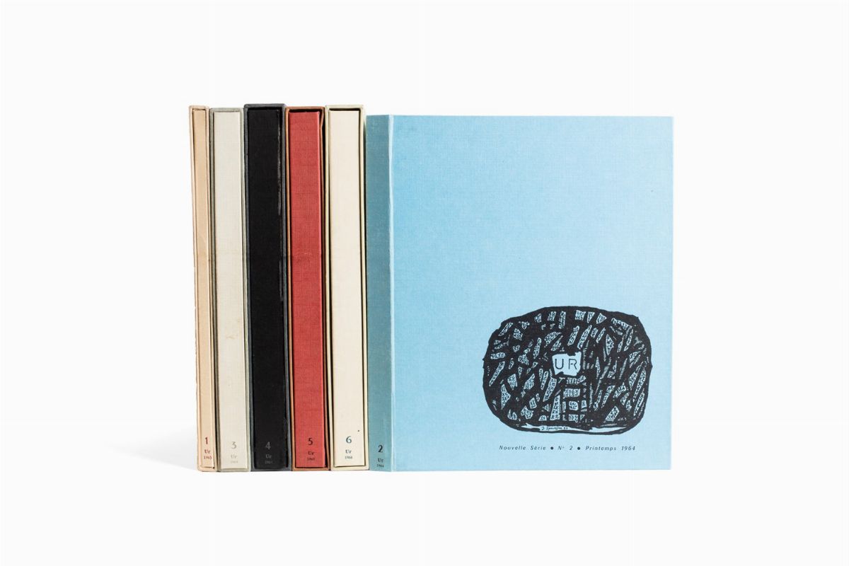 Nouvelle Série. n.1. Hiver. Parigi, Editions Brunidor, 1963. In 4°. Fogli sciolti, con illustrazioni firmate e numerate a matita da Altman, Jessemin, Sabatier e altri, all'interno "La conquête de l'univers, oeuvre d'art supertemporel" di Isidore Isou, tutto entro custodia editoriale con disegno di Lemaître e cofanetto in cartone. Edizione limitata di 130 esemplari, questo il n. 26 dei 30 fuori commercio. § Nouvelle Série. N. 2. Printemps. Parigi, Editions Brumidor, 1964. In 4°. Fogli sciolti, illustrazioni numerate e firmate a matita da Altman, Sabatier, Hachette e altri, inclusa una "gravure supertemporelle réservé aux amateurs d'Ur" di Maurice Lemaître, tutto entro custodia editoriale con disegno di Spacagna e cofanetto in cartone. Edizione limitata di 130 esemplari numerati, questo il n.85. § Nouvelle Série. N. 3. été. Parigi, Editions Brumidor, 1964. In 4°. Fogli sciolti, illustrazioni numerate e firmate a matita da Lemaître, Sabatier, Hachette e altri, inclusa una "gravure projetable" di Roland Sabatier, tutto entro custodia editoriale con disegno di Roberto Altmann e cofanetto in cartone. Edizione limitata di 130 esemplari numerati, questo il n.74. § Nouvelle Série. N. 4. Automne. Parigi, Editions Brumidor, 1964. In 4°. Fogli sciolti, illustrazioni numerate e firmate a matita da Adam, Jessemin, Spacagna, Hachette e altri, tutto entro custodia editoriale con disegno Sabatier e cofanetto in cartone, una cerniera danneggiata e un'abrasione sul piatto anteriore. Edizione limitata di 130 esemplari numerati, questo il n.8. § Nouvelle Série. N. 5. Printemps. Parigi, Editions Brumidor, 1965. In 4°. Fogli sciolti, illustrazioni numerate e firmate a matita da Gelpe, Gagnaire, Studeny, Gaulme e altri, incluso un ready-made di Lemaître, tutto entro custodia editoriale con disegno di Hachette e cofanetto in cartone. Edizione limitata di 130 esemplari numerati, questo il n.52. § Nouvelle Série. N. 6. Parigi, Editions Brumidor, 1966. In 4°. Fogli sciolti, illustrazioni numerate e firmate a matita da Michel Tapié, Girard, Vautrier e altri, inclusa "anthologie sonore de lettries dites par leurs auteurs I" e "envelope de réexpédition supertemporelle" di Maurice Lemaître, tutto entro custodia editoriale con disegno di Minola e cofanetto in cartone. Edizione limitata di 130 esemplari numerati, questo il n.21.