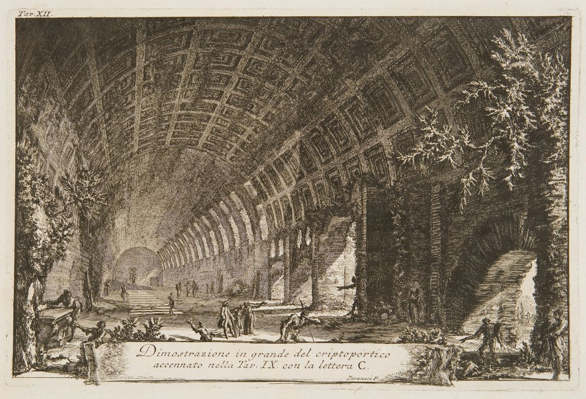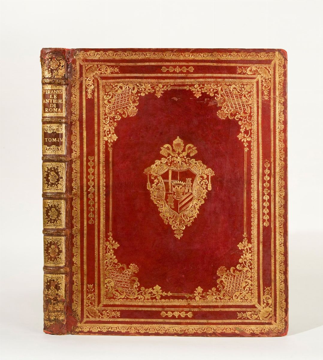 Roma, Angelo Rotili, venduto da Bouchard, 1756. In 2°. 4 voll. Occhiello, ritratto di Piranesi di Polanzani, totale di 218 tavole finemente incise in rame, numerate 1-44, 1-63, 1-54 e 1-57, comprendenti 1 doppia pagina di titolo addizionale, 3 fogli col titolo, 2 carte di indice, 1 testatina, 1 finalino e 6 capilettera tutti di Piranesi, Barbault e G. Rossi, testo e tavole montati su brachette, fioriture sparse e qualche brunitura, qualche macchia di umidità ai margini bianchi di pochi fogli. § Lapides Capitolini sive fasti consulares triumphalesq romanorum ab urbe condita [...] Roma, 1762. In 2°. Occhiello, Frontespizio, carta dedicatoria incisi, 1 tavola più volte ripiegata e 2 vignette, 45 tavole numerate. Legato con Delle Antichità di Cora. Frontespizio, testata e 10 tavole, alcune delle quali ripiegate, numerate I - X. Legato con Del castello dell'acqua Giulia. Frontespizio, 2 grandi capilettera, 2 cul-de-lamps d'Albano e di Castel Gandolfo. Roma, 1764. Frontespizio inciso, tavola dedicatoria a doppia pagina a Papa Clemente XIII, con 26 tavole montate su brachette, fioriture ed arrossature leggere. Legato con Descrizione e disegno dell'Emissario del Lago Albano. [Roma: 1762-64]. Frontespizio inciso, 9 tavole. Legato con Di due spelonche ornate dagli antichi alla riva del Lago Albano. [Roma: 1762-64]. Con 12 tavole.