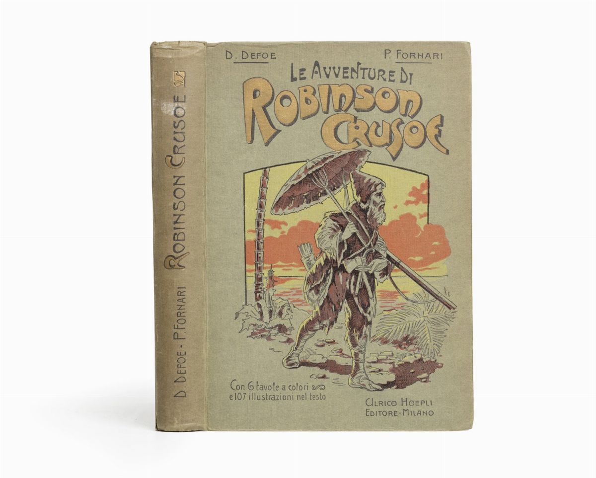 Milano, Sonzogno, s.d. In 4°. Illustrazioni in bianco e nero, legatura editoriale in tela decorata. § Daniel Defoe. Le avventure di Robinson Crusoe racconto educativo fatto italiano da P. Fornari. Terza edizione. Milano Hoepli, s.d. Illustrazioni nel testo e 6 tavole fuori testo a colori, leggermente ingiallito, legatura coeva in tela decorata. § Miguel de Cervantes Saavedra. Don Chisciotte della Mancia racconto...tratto dal capolavoro...da Giovanni Mari. Milano, Hoepli, 1932. In 4°. Illustrazioni nel testo e 6 tavole fuori testo a colori, legatura coeva in tela decorata. Insieme nel lotto: Molnar, "I ragazzi della via Pal", Roma, Edizioni Sapientia, 1929 e Térésah, "La leggenda del giullaretto", Firenze, Bemporad, 1924.