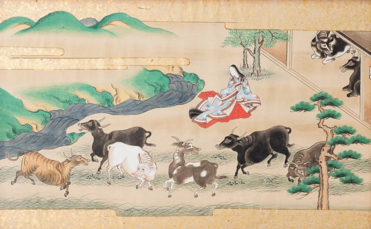 Due dipinti su carta con colore ed oro, periodo Edo/Meiji, su passepartout in tessuto e cornice in legno dorato di paesaggi con con donna ed animali, fiume ed uomo