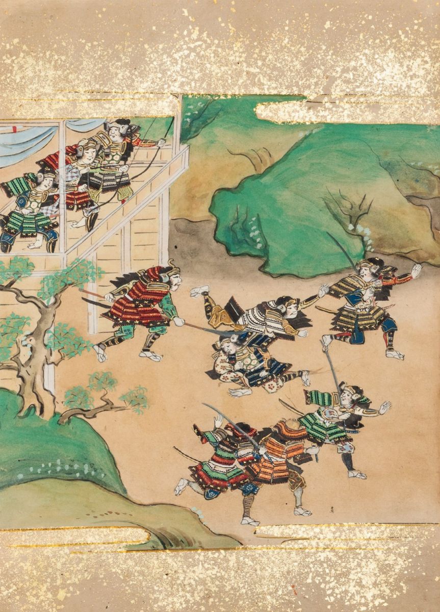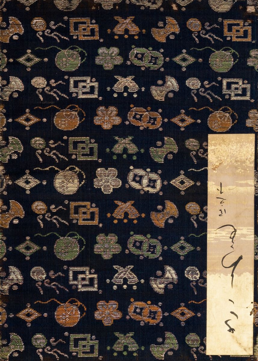 Album composto di 34 bifolii con al recto tavola eseguita a tempera ed oro, ed al verso testo, due piatti di copertina in tessuto ricamato con motivi decorativi policromi e fili d'oro, del periodo Edo/Mejii, ciascuna circa mm. 231x169, leggera brunitura.