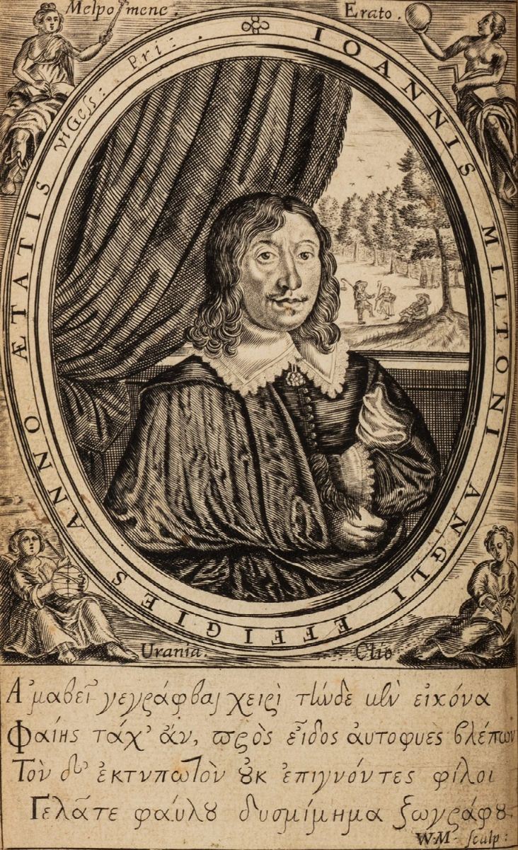 London, Ruth Raworth for Humphrey Moseley, 1645. In 8°. 147 x 98 mm. Ritratto inciso all’antiporta opera di William Marshall, frontespizi ad apertura di A Mask e di Poemata, margine superiore lievemente rifilato con perdita minima ai numeri delle pagine e al ritratto iniziale, ultima carta restaurata al margine interno, raffinata legatura del sec.XIX in marocchino rosso di Lloyd Wallis and Lloyd, piatto inferiore staccato. Ex libris al contropiatto di R.B. Adam (1863-1940) raffigurante Samuel Johnson, impresso su un ovale in marocchino marrone; al foglio di guardia dedica-dono a T.T.M, probabilmente Tom Mosley, circa 1930.