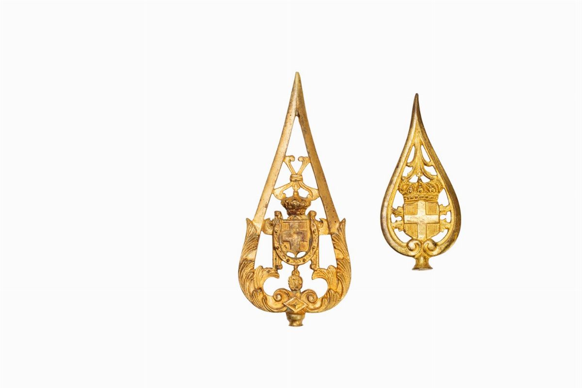 Puntale in ottone da bandiera, riccamente decorato, con stemma e corona sabauda, h 32,5 cm. § Insieme nel lotto 3 puntali con stemma sabaudo di varie dimensioni e 1 puntale con aquila, stemma e motto sabaudo, tutti in ottone.