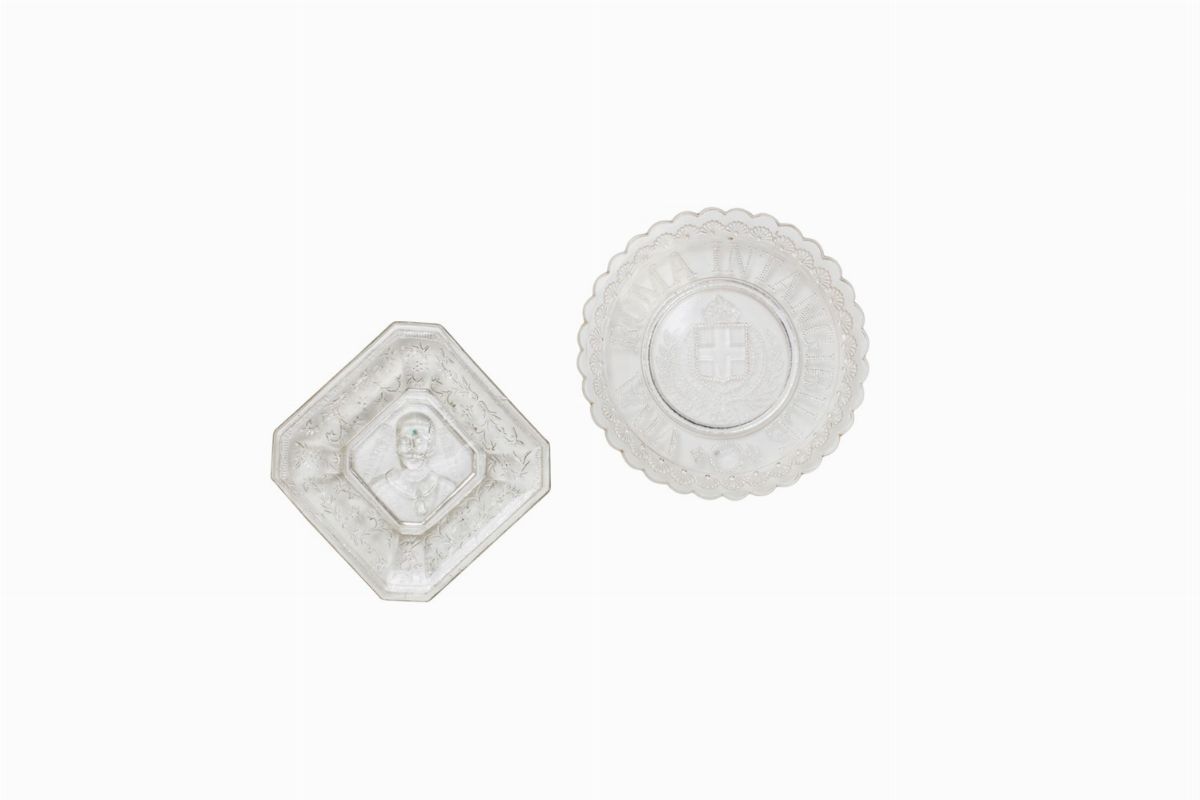 Vassoio in ceramica con cornice tricolore e ritratto di Umberto Savoia e due bandiere con stemma sabaudo, sul retro marchio S.C. Richard, cm 32 x 23, alcuni difetti. § Nel lotto anche un piattino in vetro con motto "Viva Roma Intangibile" e al centro stemma Savoia, cm. 13 circa. Insieme un piattino di vetro quadrato con "Vittorio III Re d'Italia" e ritratto centrale del regnante, cm 10, uno in ceramica con stemma e corona sabauda con marchio,