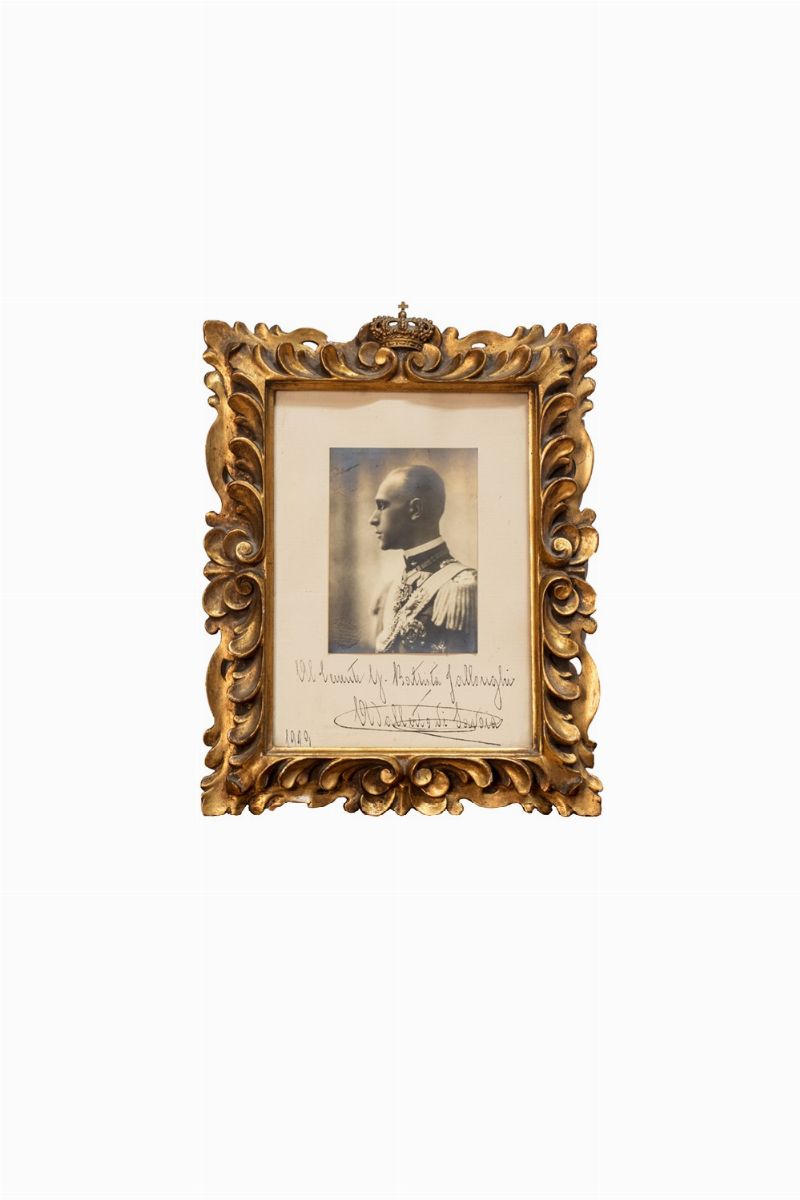Fotografia con dedica e firma autografa di Umberto di Savoia, datata 1919, con timbro a secco del fotografo, leggermente scolorita, in cornice dorata coeva, con corona reale sul lato superiore. § Insieme nel lotto due foto incorniciate che ritraggono Umberto di Savoia con dedica e firma del regnante, di cui una datata 1936.