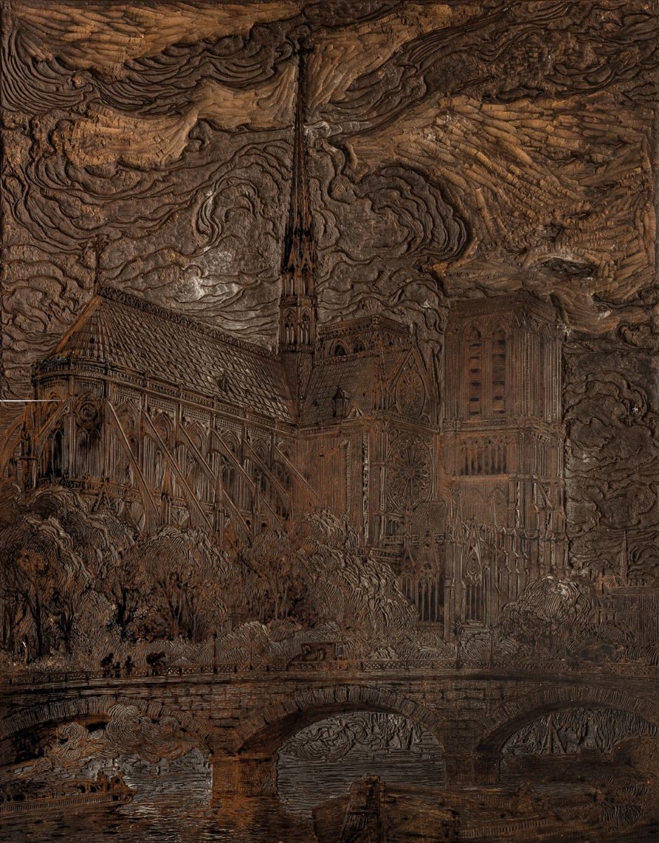 Legno originale per la silografia, [sec.XIX], "Veduta della Cattedrale di Notre-Dame dall'abside", legno di testa in quindici blocchi accostati per complessimi mm. 400 x 320.