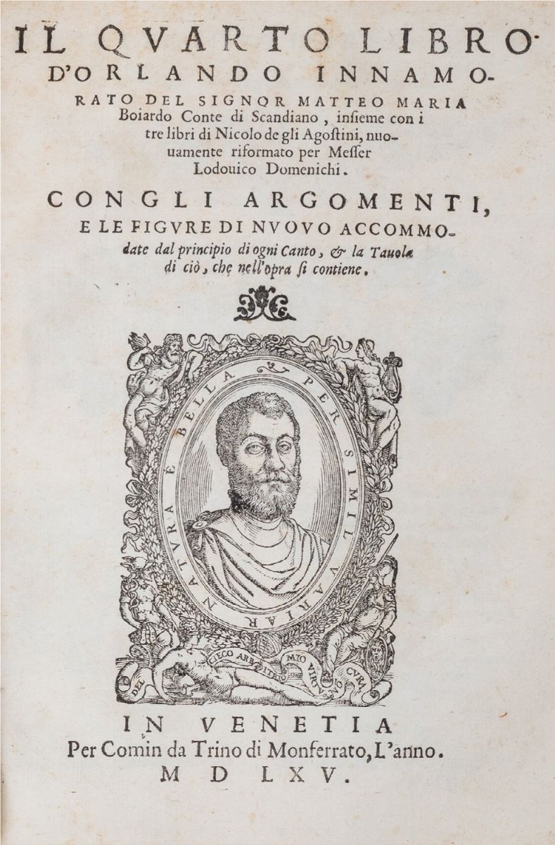 Venezia,Comin da Trino, 1565. In 4°. Legato conIl quarto libro d'Orlando innamorato, stessi dati tipografici. Entrambi i frontespizi con ritratto a piena pagina, a carta Aii grande vignetta a mo' di testata, in apertura di ciacun canton vignetta istoriata, eleganti capilettera decorati, testo disposto su 2 colonne in carattere corsivo, qualche carta con arrossature ed alcune nella seconda opera fortemente brunite, legatura coeva in pergamena con titolo manoscritto al dorso, corpo del testo staccato dal dorso, lacune. Note di possesso ai fogli di guardia ed all'ultima carta stampata.