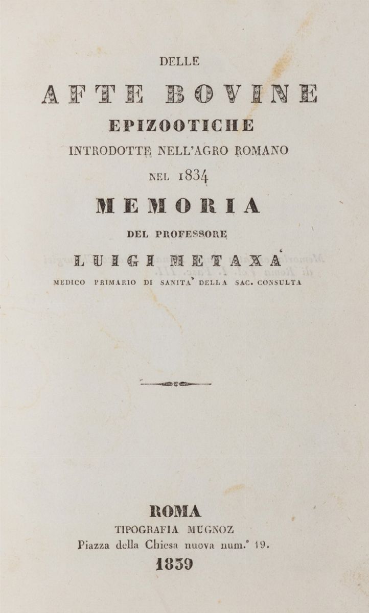 Nello stesso volume sono legate ulteriori 4 opere come da indice manoscritto sulla carta di guardia, ormai poco leggibile. "Articolo sulla nutrizione dei bestiami" di Pio Bofondi", s.d.; "Trattato degli innesti" di Antonio Piccioli, Firenze, 1835, con 2 tavole calcografiche; "Delle afte bovine epizootiche introdotte nell'agro romano nel 1834 memoria" di Luigi Mataxà, Roma, 18398; "Sui pascoli comunali memoria" di Casimiro Falzacappa, articolo estratto dal giornale scientifico-letterario di Perugia del 1842.