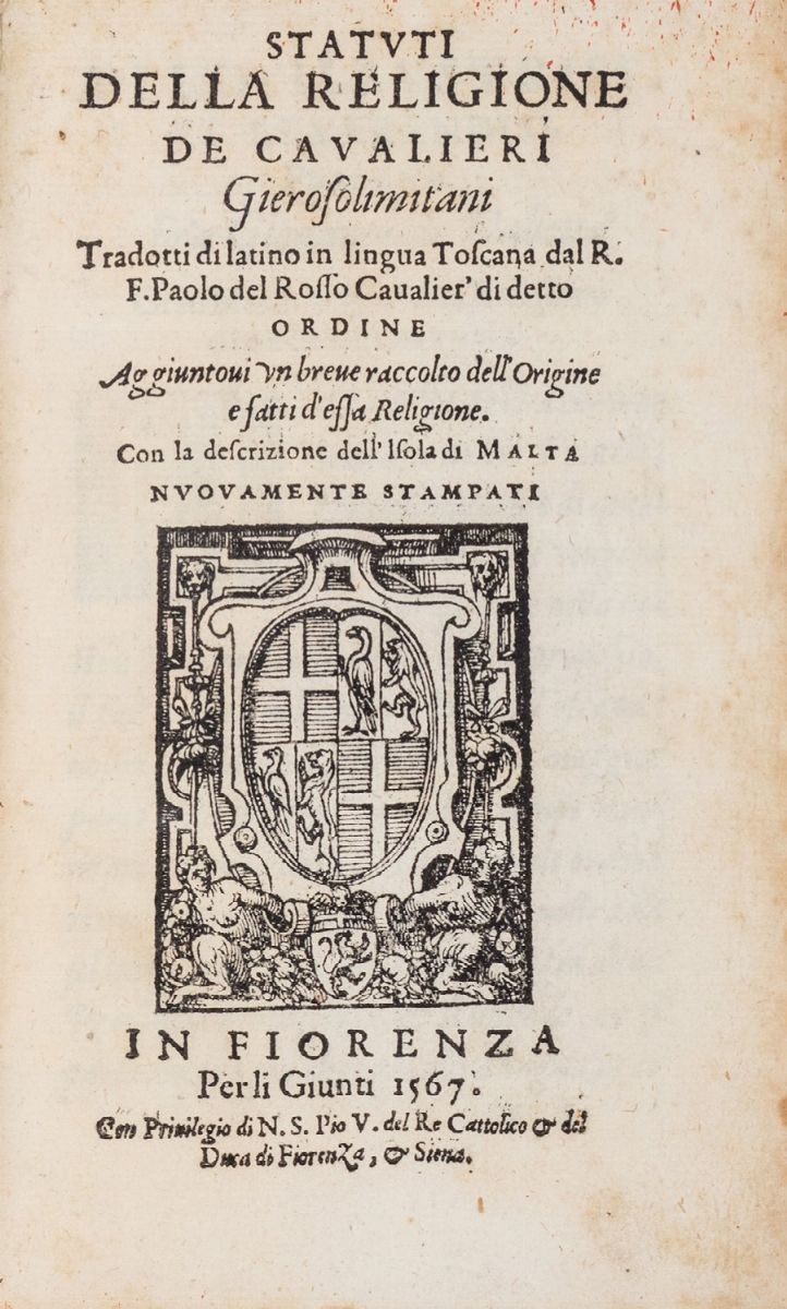 Statuti della religione de cavalieri Gierosolimitani tradotti di latino in lingua Toscana dal R.F. Paolo del Rosso, 1567
