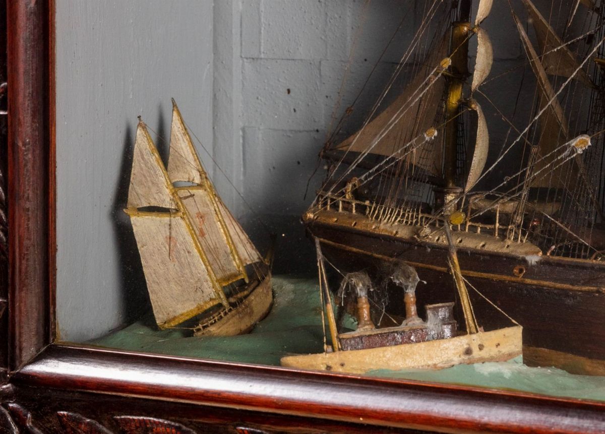 [sec. XX]. Con un veliero a 4 alberi, una goletta e un battello in navigazione, realizzati in legno dipinto e tessuto, entro teca di legno finemente decorata con motivi floreali e stemma al centro, quattro guglie nella parte superiore, cm. 67 x 75 x 30.