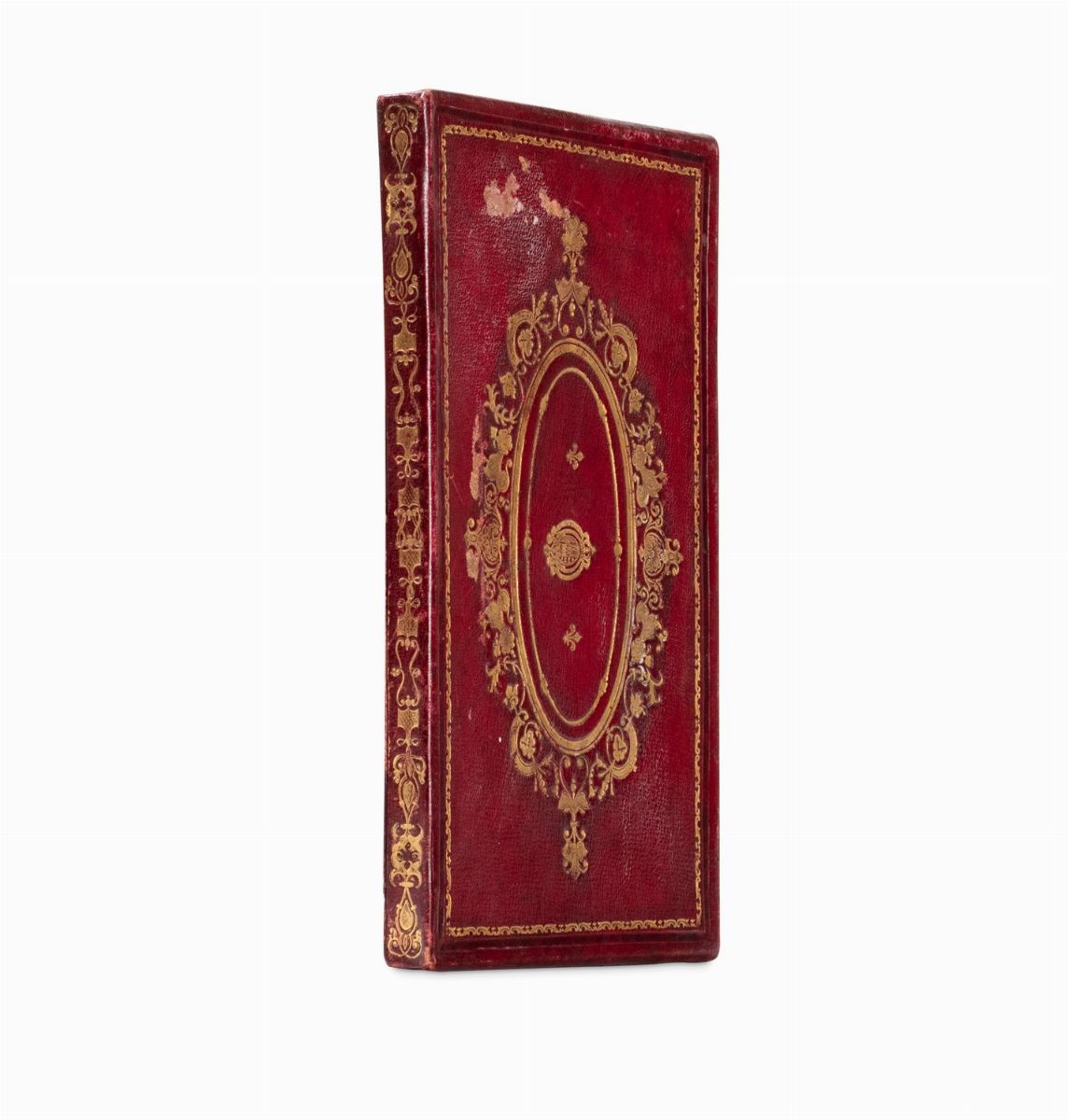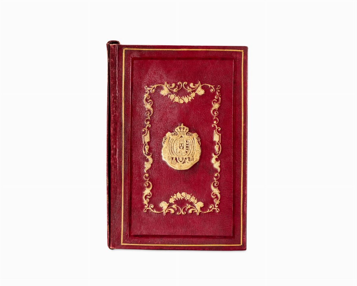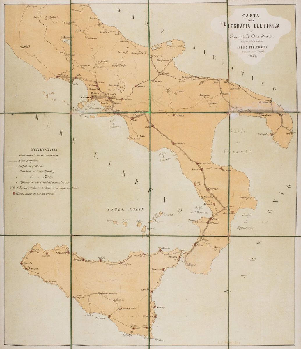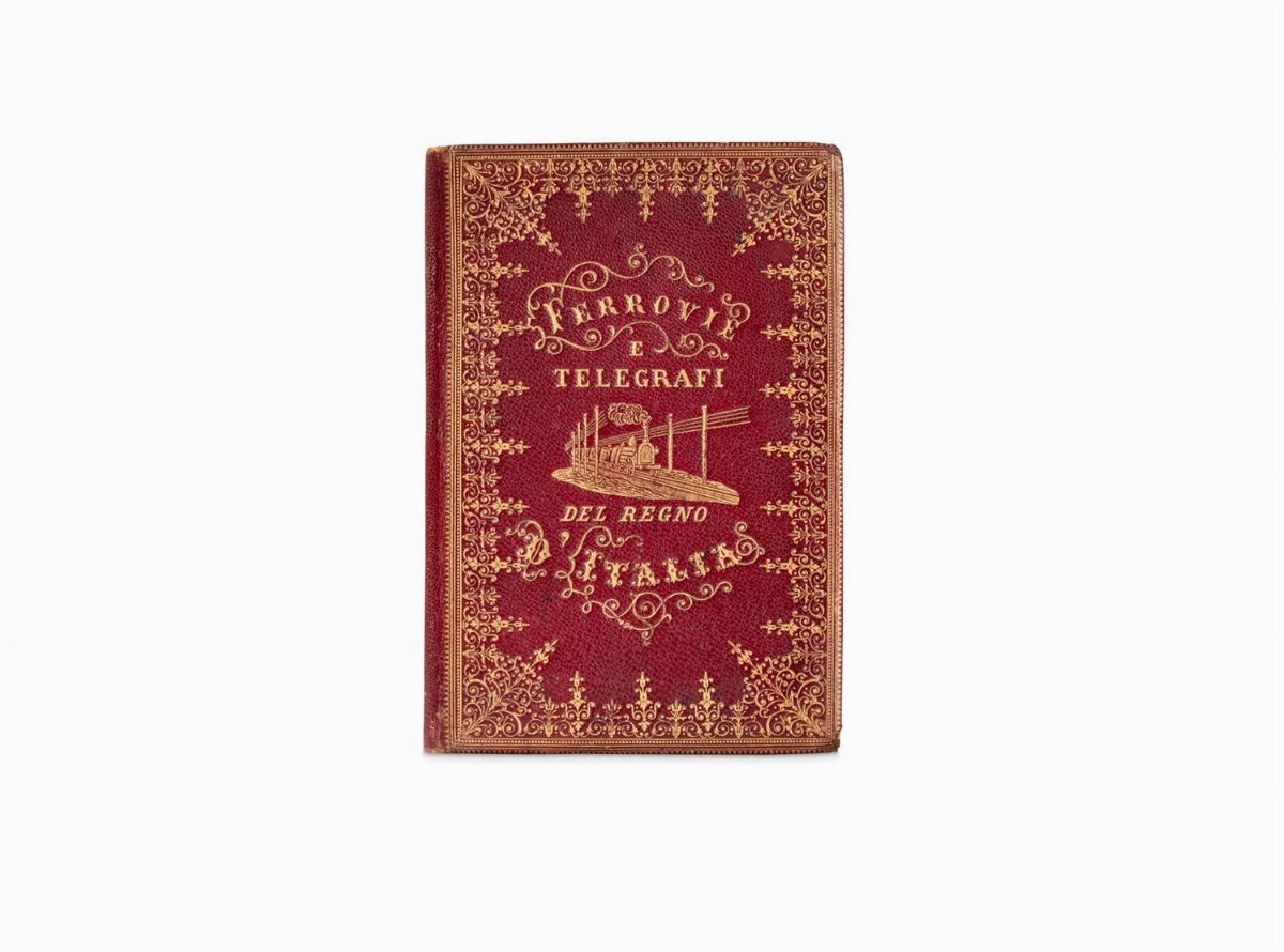 [Napoli], 1858. Carta incisa in rame, mm 675 x 550, su 12 cartoncini applicati su tela, acquerellata a mano, tela strappata in più punti, legatura coeva in pelle impressa a secco e in oro con filetti e cornice a volute che racchiude lo stemma borbonico su entrambi i piatti, entro custodia in cartone con decorazione simile alla legatura, qualche abrasione sprattutto sulla custodia. Insieme nel lotto una piccola legatura del secolo XIX in pelle impressa in oro con la scritta al piatto anteriore "Ferrovie e telegrafi del Regno d'Italia".