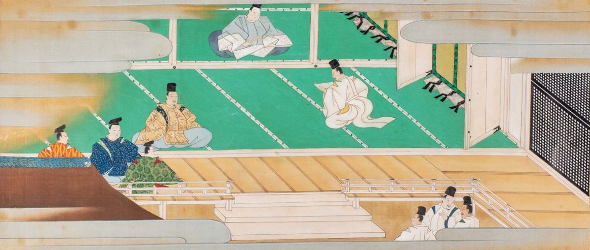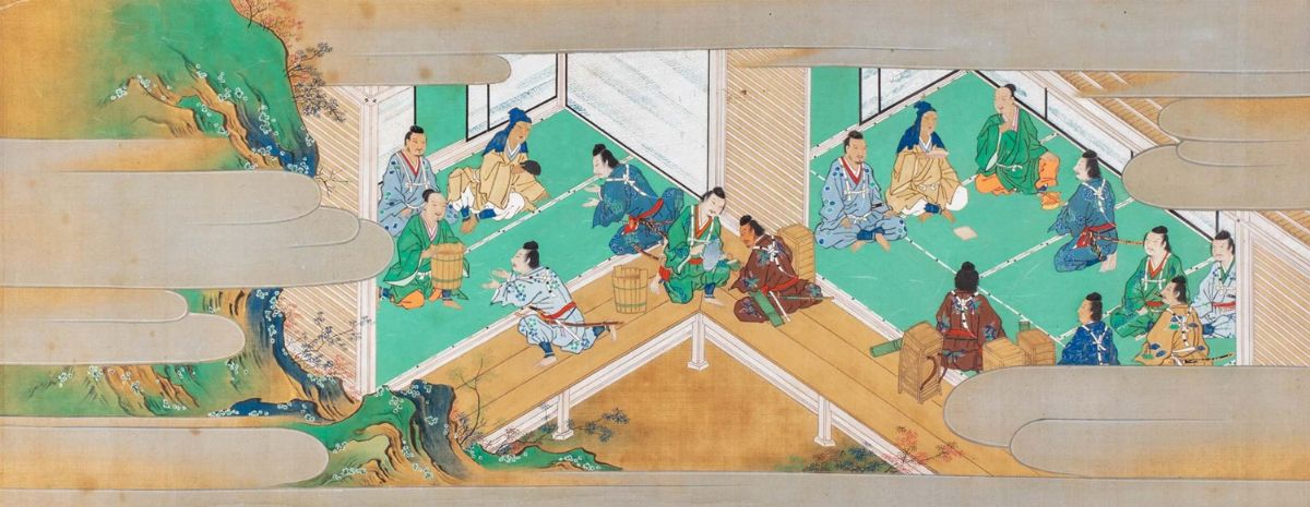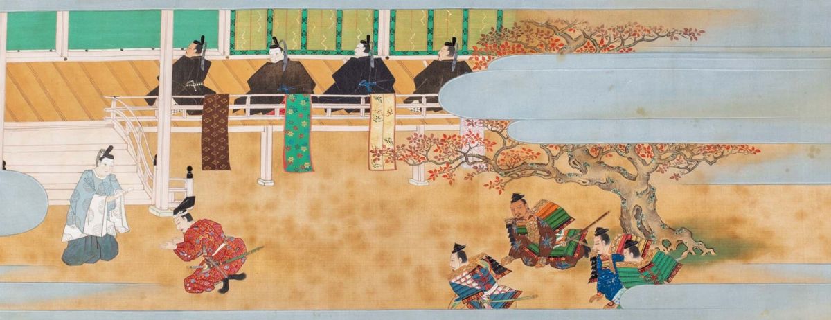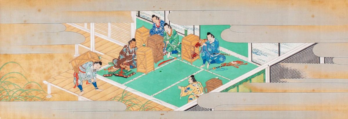 5 dipinti a colori su tessuto con contorni in oro, Scuola Tosa, periodo Edo, raffiguranti scene di vita con dignitari e samurai all'interno di palazzo, da mm. 335 x 506 a mm. 335 x 960, alcune macchie, leggere bruniture.