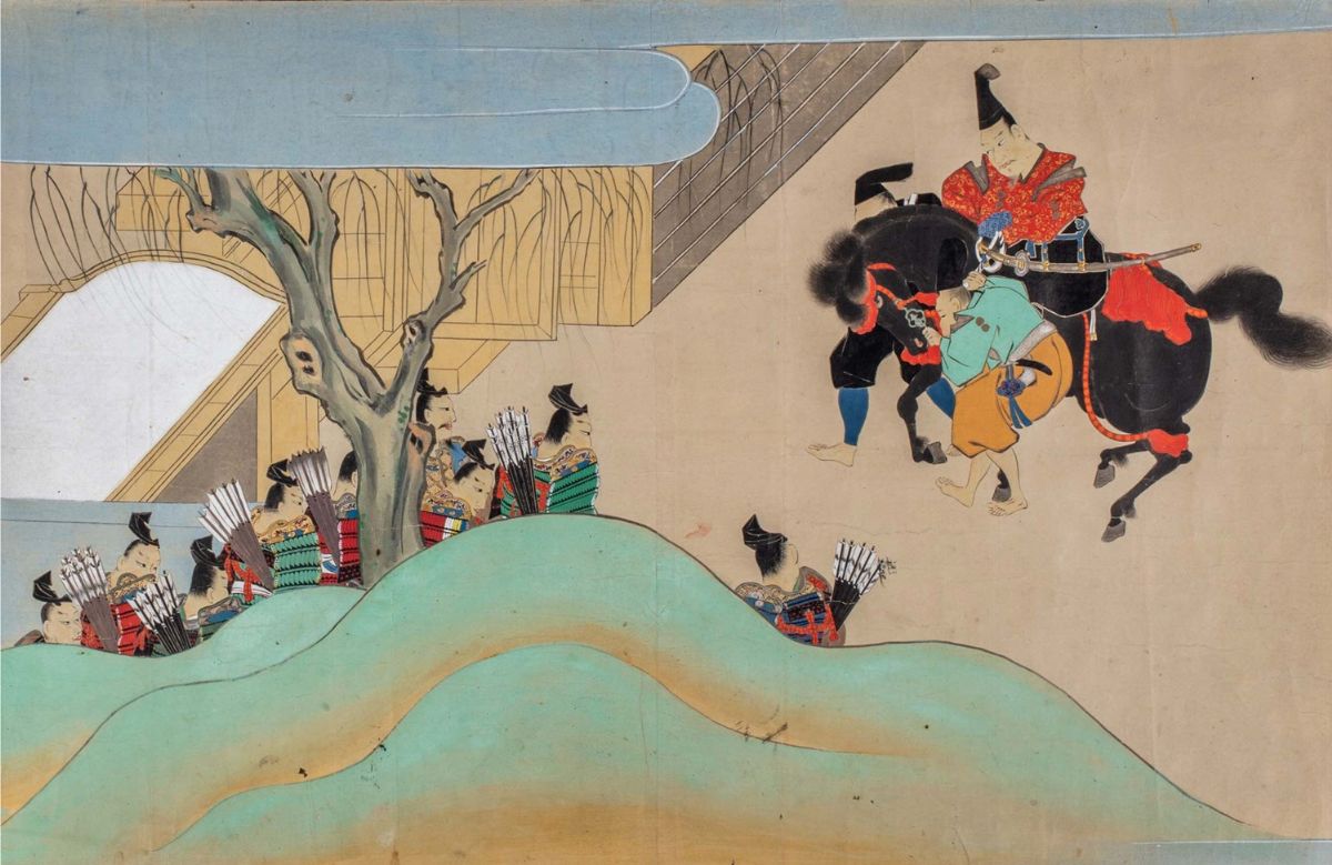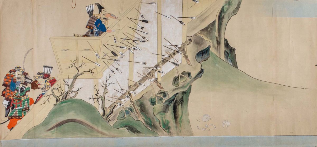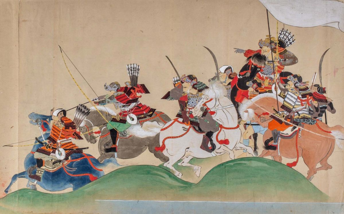 4 dipinti su carta a colori, Scuola Tosa, periodo Edo, raffiguranti scene con samurai e oni, da mm. 438 x 693 a mm. 438 x 945, alcuni strappetti ai margini e qualche macchia.