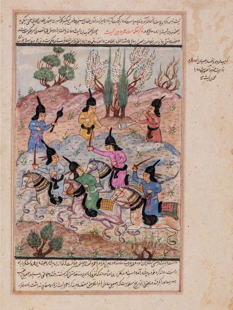 2 miniature su carta [sec. XVIII], ciascuna mm. 355 x 230, con scene di cavalieri, leggeri aloni al margine.