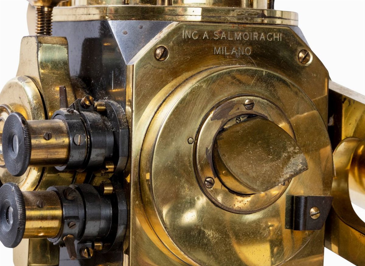 [sec. XX].In ottone, marchiato "Inc. A. Salmoiraghi Milano". Base a tre piedi con viti di regolazione della messa in bolla e micrometrica, cannocchiale su due montanti a forcella, cerchio goniometrico graduato, cm. 50 x 46 x 18.