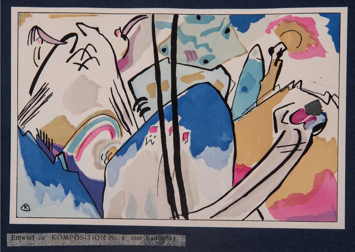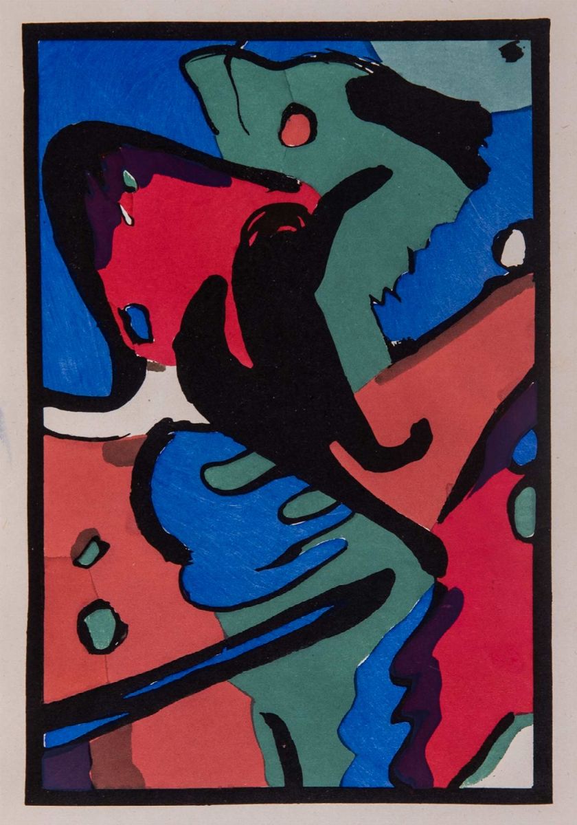 Monaco, R. Piper & co. Verlag, 1912. In 4°.Testo in tedesco, con 4 tavole a colori, una di Marc protetta da velina, la prima raffigurante S. Martino e quella di Kandinsky su cartoncino nero, illustrazioni in bianco e nero nel testo, iniziali di Marc e Jean Arp, fogli ripiegati con righi musicali di Schonberg, Berg e Webern, p.1 con rinforzo al margine interno, copertina editoriale illustrata con due incisioni su legno a colori di Kandinsky la copertina è conservata in una legatura moderna in mezza pelle, qualche macchia.