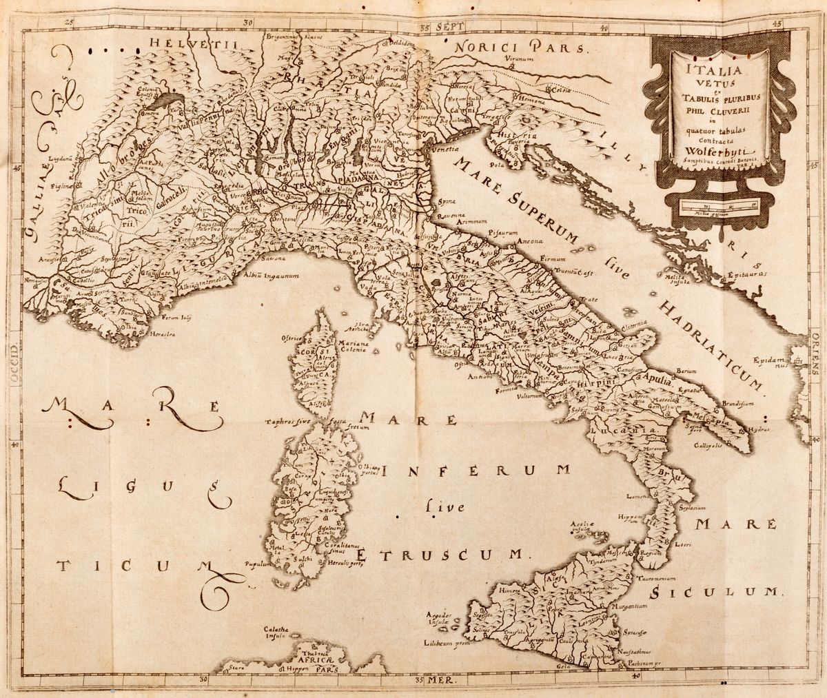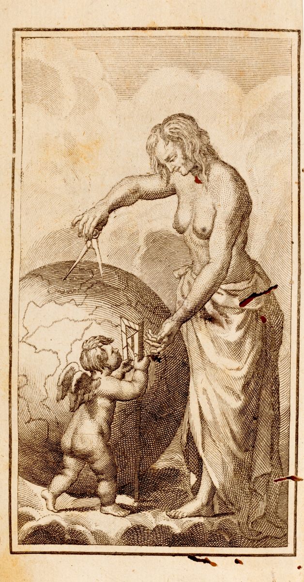 Wolfenbüttel, Konrad Buno, 1659. In 4th. Chalcographic allegorical title page, with 5 folded plates engraved in copper out of text, of which one topographic of Rome and 4 geographic of Italy, woodworm holes, two tables with a small gap in the central part, light uniform browning, some paper with slight reddening, binding coeval in parchment with traces of green silk laces, blue cuts, gap in the back, woodworm holes, defects. Ex libris on the title page. § Together in the lot & nbsp; Buffier, Claude , & nbsp; New geography . & Nbsp; Rome, Venanzio Monaldini and Giovanni Zempel, 1787. In 12 °. Allegorical chalcographic frontispiece, frontispiece in red and black ink with copper engraved vignette, with 22 folded copper engraved plates, woodworm holes, slight homogeneous browning, light blooms, some tears on some plates, e6-7 detached, contemporary binding in parchment, author and title stamped in gold on the spine, marbled cuts, small gap in the cap, slight defects. Signature of belonging to the title page.