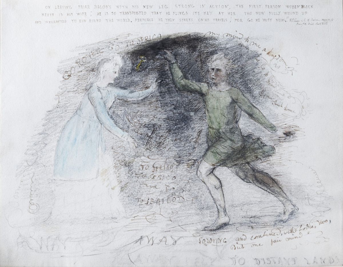 Large volume in red half morocco and pink canvas with title on the spine Etchings by R.C. Lucas Life of Friar Bacon , and on the rose window in the center of the plate The Wonderful Life of Friar Bacon by RCLucas 1871 , external measures 335 x 280 mm., 104 internal measuring sheets 328 x 260 mm. with written pages that alternate with drawings, many host engravings of various sizes and drawings, some pages as a collage with text, drawings and photos, at the end of the volume some pages of Nature Print with an original plant leaf printing system printed on paper.