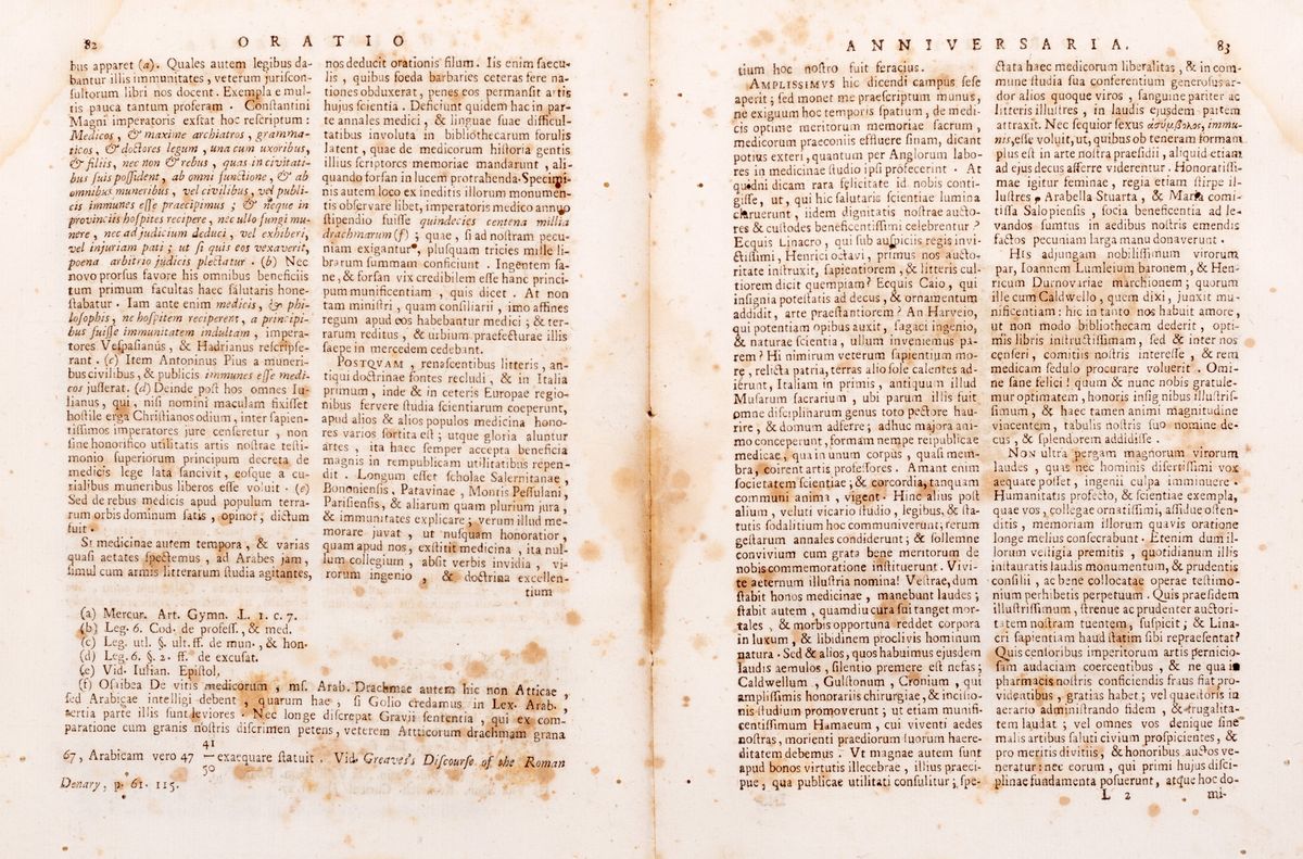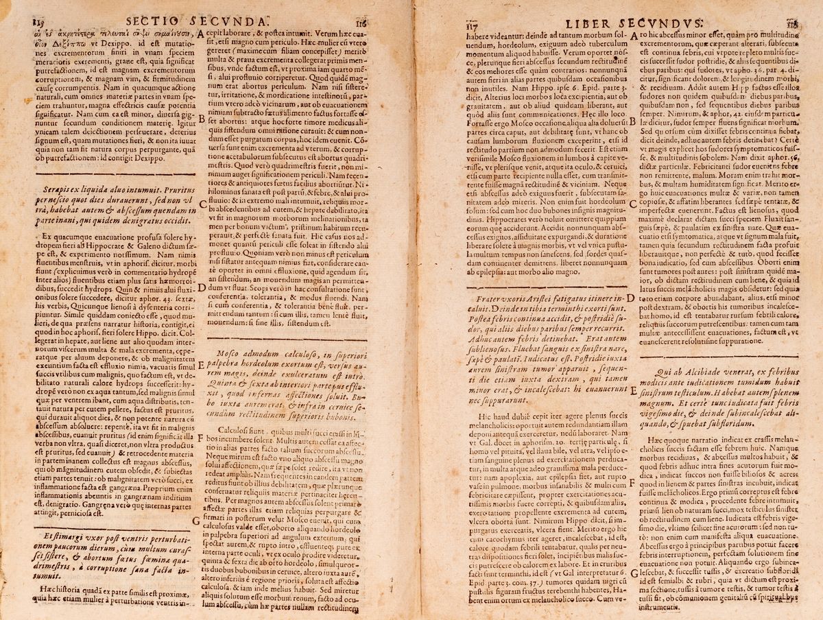 Padua, Giovanni Manfrè, 1716. In 8 °. Small eye, woodcut frieze on the frontispiece, initials and friezes engraved in wood, woodworm work on the inner margin, sporadic blooms, contemporary parchment binding, manuscript author and title on the spine, some woodworm holes, small lacks in the hinges and cap, slight defects. § Mead, Richard. & nbsp; Medical work. Figuris illustrata, Venice, Antonio Bortoli, 1752. In 4 °. & Nbsp; 7 parts in 1 vol. Woodcut frieze on the title page, headbands and initials engraved in wood, in part V 3 numbered plates outside the text, in part VII 4 numbered plates on 2 sheets, scattered blooms, woodworm holes, some slight halo, coeval binding in hardcover, partially missing spine , some woodworm holes. § & nbsp; Vallés, Francisco. & nbsp; Commentary, in septem libros Hippocrat De morbis popularibus, nunc primum in Galliis excusa [...] , & nbsp; Orléans, Claude & amp ; Jaques Borde, 1654. In 2nd. Coat of arms of the dedicatee and intaglio initial a & nbsp; χ1, friezes and xylographic initials, & nbsp; tear with loss at the lower margin of the title page, light browning, some slight halo and blooms, loss of text in the last issues, coeval parchment binding, manuscript title at back, lacks in the anterior plate, defects. Ex libris manuscript on the title page
