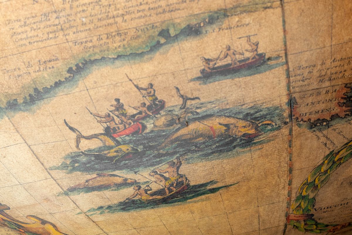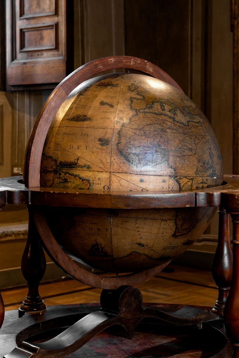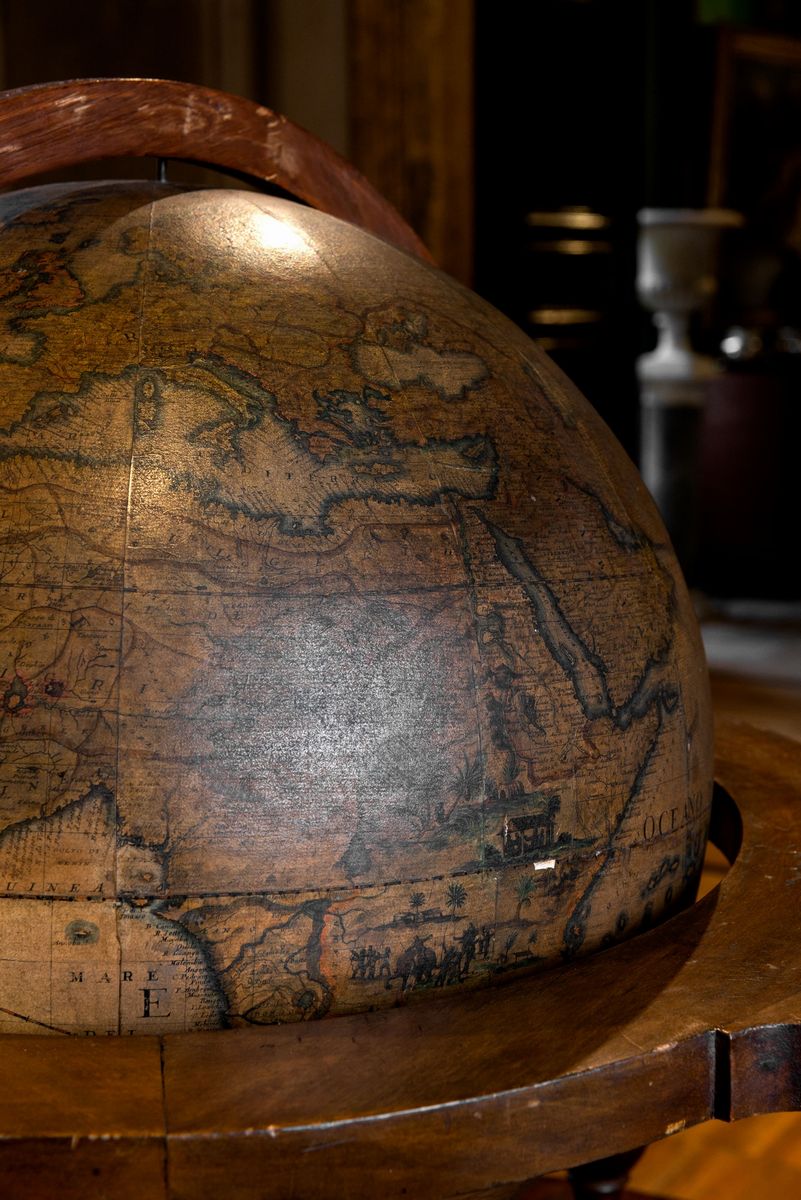 Venice, 1696, globe composed of 12 gore engraved in copper, two polar caps, sphere mounted on a wooden meridian (later), raised with 4 wooden columns (later), along the Antarctic Circle the inscription "& nbsp; TIERRA D AUSTRE THE AUSTRAL OR SOUTHERN MAGELLANIC LAND INCOGNITA ", and & nbsp; cartouche with notes on Magellan's journey, another cartouche surmounted by a laurel wreath with the inscription "Pater Magister / Vincentius Coronelli / Min:Conv:S.Francisci/serenissimae/ Venetorum & nbsp; Reipubicae / Cosmographus / MDCLXXXXVI, defects, some defects , restorations.