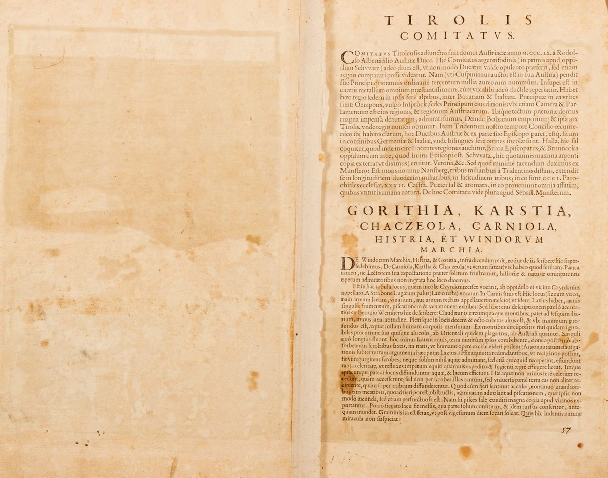 La carta del Tirolo copre le Alpi austriache e italiane. La seconda mappa continua a sud dell'Austria per mostrare parte della Slovenia, della Croazia e della penisola istriana. Tratte dal "Theatrum Orbis Terrarum" del 1574.