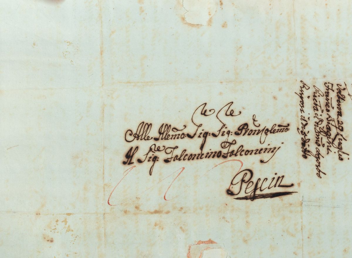 Due consistenti faldoni in foli, 300 x 215 mm., numerati rispettivamente VIII e XIII relativi alle attività e alle relazioni sociali del nobile Falconcino Falconcini, nipote di Benedetto Falconcini. Vescovo di Pescia nel 1684, centinaia di lettere indirizzate a corrispondenti vari, in prima pagina il registro dei destinatari, legatura archivistica in mezza pergamena e cartone.
