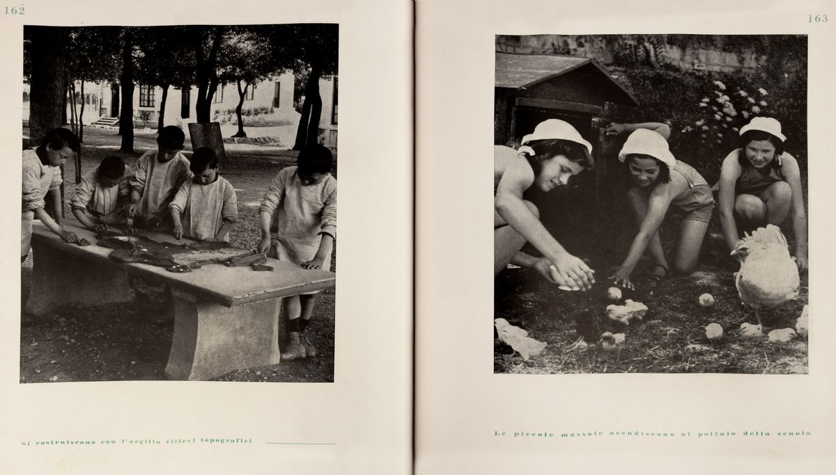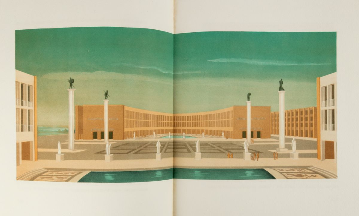 Roma, Commissariato Generale dell'Esposizione Universale di Roma, 1939, 30x25,5 cm., legatura in piena pergamena con titoli e stemma impressi in oro, custodia, pp. 88 (4), 2 ritratti in seppia, 16 bellissime tavole a colori con progetti di Sironi, Dazzi, Quaroni ecc. e 10 illustrazioni e tavole b.n. n.t. Fra i collaboratori vi furono gli architetti Libera, Moretti, Muratori, La Padula, Samonà, Michelucci, Figini e Pollini, Quaroni, Muzio e del Debbio. Il libro illustra il progetto dell'Esposizione Universale di Roma prevista per il 1942 (la famosa "E 42") che non fu realizzata a causa della guerra. Alcune macchie sulla copertina.