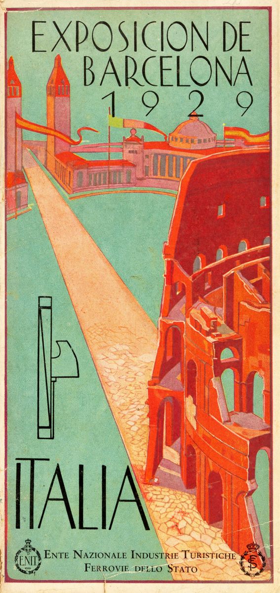 s.l. (Barcelona), s.e., s.a. (1929), 23x16,4 cm., brossura, pp. (16), copertina illustrate a colori a piena pagina, 1 veduta a doppia pagina dell'Esposizione. Opuscolo interamente illustrato con bei disegni animati a colori raffiguranti i principali Padiglioni dell'Esposizione e i Monumenti della città: Palacio de Arte Moderno, Palacio Nacional, Palacio de las Artes Industriales y Aplicadas, Palacio de Comunicaciones y Transportes, Palacio del Trabajo, palacio de Proyecciones, Palacio de la Seccion de Agricoltura, Palacio de las Misiones, Pabellon del Estado, Palacio del Material Deportivo, Estadio. Una piccola mancanza all'angolo della copertina anteriore. Edizione originale. § Exposicion de barcelona 1929, Italia, Ente nazionale industrie turistiche ferrovie dello stato, 1929, opuscolo. § De Yrizar, Joaquin, Arquitectura Popular Vasca, s.l., s.e., 1934, 32x22 cm., brossura, pp. 15-(1), copertina tipografica con illustrazione applicata al piatto (disegno dell'architetto Joaquin de Yrizar), 12 illustrazioni fotografiche e 3 figure architettoniche al tratto disegnate dall'autore con esempi di case e rustiche e polari dei Paesi Baschi. Testo di una conferenza tenutasi a Vergara in occasione del V Congreso de Estudio Vascos (settembre del 1930). Prima edizione in volume.