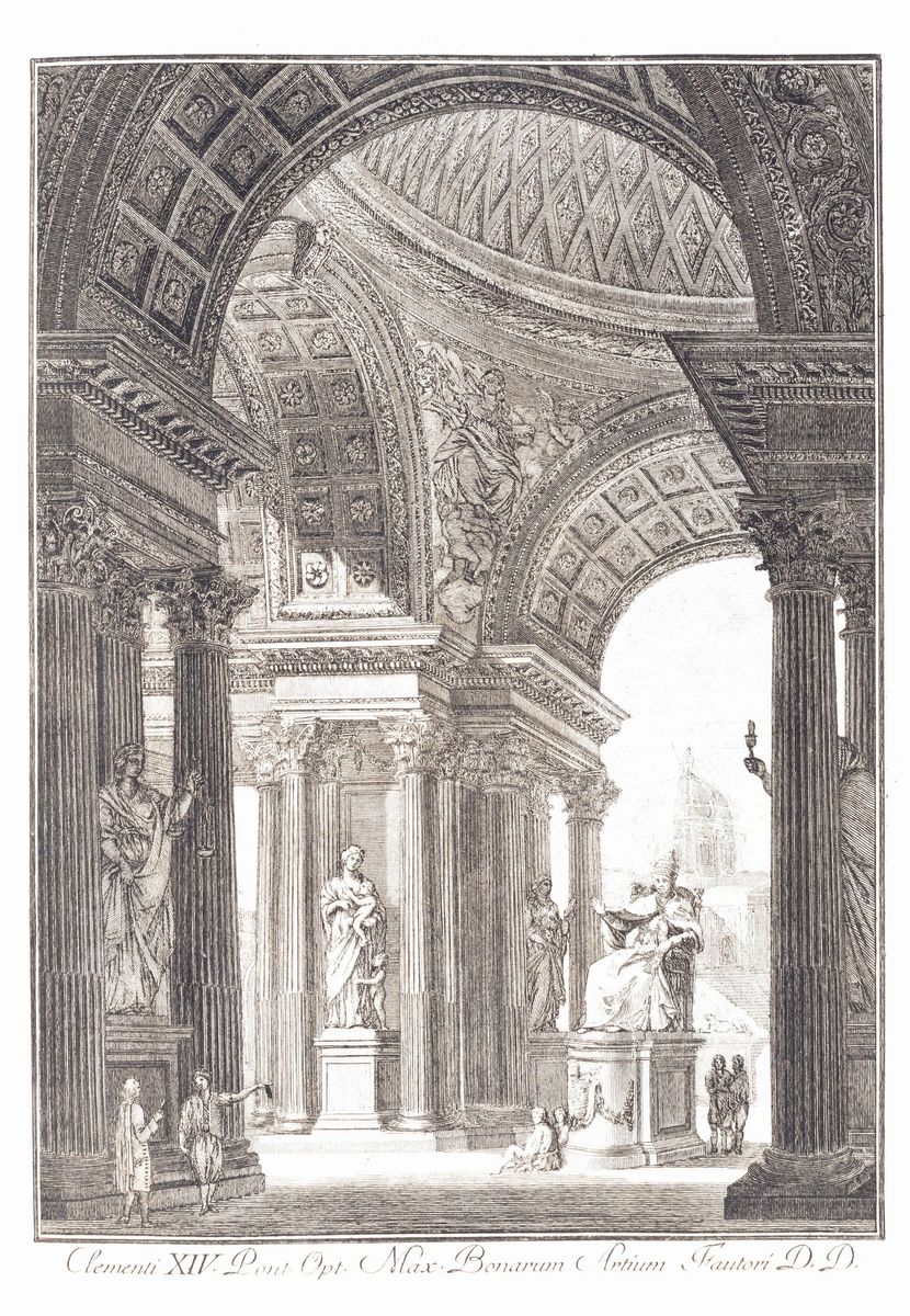 Roma, Stamperia di Marco Pagliarini, 1770. In 2°. Antiporta allegorica, tavola con ritratto di Clemente XIV, frontespizio con vignetta incisa, iniziali 4 tavole numerate, 41 tavole incise numerate, una tavola aggiunta raffigurante la statua di Clemente XIV in un interno di Basilica, 9 tavole fuori numerazione, illustrazioni incise, iniziali e decorazioni xilografiche, esemplare particolarmente fresco, legatura moderna in piena pergamena e cartone.