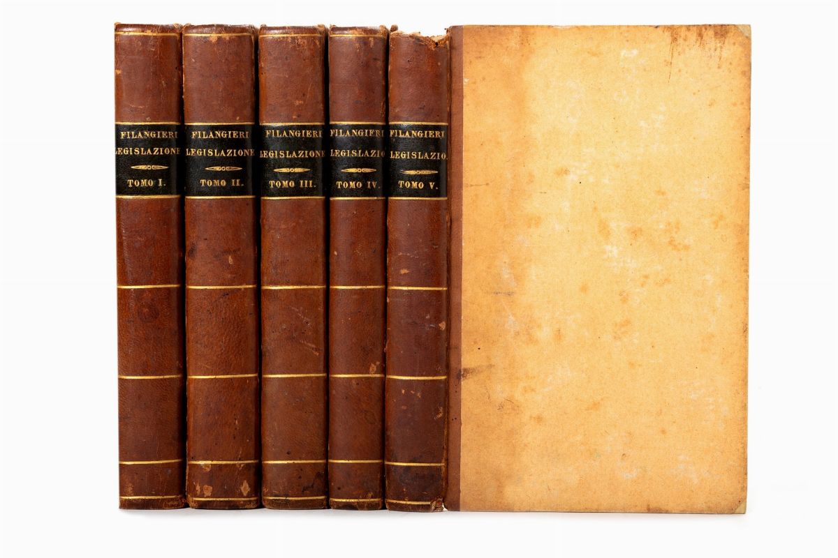 Milano, Giuseppe Galeazzi Regio Stampatore, 1784-1791 (per l'ultimo tomo postumo). In 8°. 5 tomi in 11 voll. Fregio xilografico sui frontespizi, iniziali xilografiche, qualche lieve arrossatura e fioritura, legatura di epoca successiva in mezza pelle, autore, titolo, numero di tomo impressi in oro al dorso liscio, tagli screziati azzurri. Firma di appartenenza al frontespizio del I vol. e timbri ai frontespizi. § La scienza della legislazione, Filadelfia [ma Livorno], Stamperia delle Provincie Unite, 1807. In 8°. 5 voll. Leggera brunitura, legatura di epoca successiva in mezza pelle, autore, titolo e numero di tomo impressi in oro entro tassello al dorso, lievi difetti.