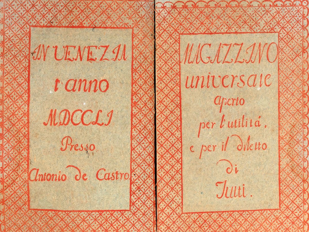Venezia, Antonio De Castro,1751. In 8°. Numeri 1,2,3 in 1 vol con numerazione continua. Con 4 tavole a piena pagina incise in rame nella prima parte e 2 tavole nella seconda, lieve gora d'acqua ai primi fascicoli, qualche lieve fioritura e arrossatura, brossure editoriali con piatti decorati conservati all'interno di legatura coeva in cartoncino decorato, segni di usura, lievi difetti.