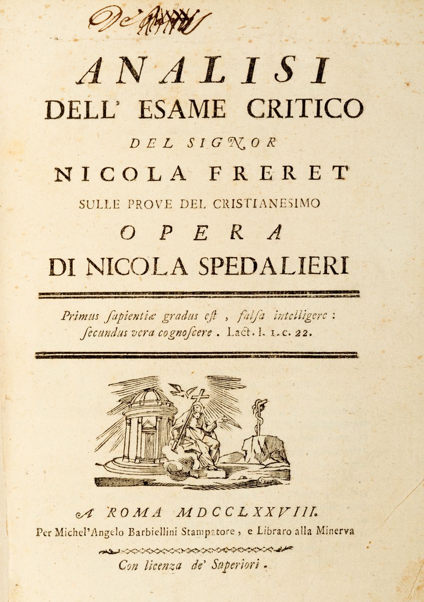 Roma, Michelangelo Barbiellini, 1778. In 4°. Vignetta xilografica al frontespizio, fregi e capilettera incisi in legno, leggera brunitura, più intensa su alcuni fascicoli, fioriture, leggero alone di umidità all'angolo esterno inferiore, carta di guardia staccata, frontespizio leggermente allentato, legatura coeva in pergamena, tracce dell'autore manoscritto al dorso, tagli marmorizzati, qualche foro di tarlo al dorso, lievi difetti. Firma di appartenenza parzialmente cancellato al frontespizio e carta di guardia. § Analisi dell'esame critico del signor Nicola Freret sulle prove del Cristianesimo, Assisi, Ottavio Sgariglia, 1791. In 4°. 2 parti in 1 vol. ciascuna con proprio frontespizio, ritratto dell'autore inciso in rame in antiporta, piccola macchia al margine bianco superiore delle prime carte, leggera brunitura, lievi fioriture e arrossature, legatura coeva in mezza pelle, autore, titolo e numero di tomi impressi in oro entro tasselli al dorso a 5 nervi, qualche piccola lacuna e foro di tarlo, leggeri difetti. Firma di appartenenza e alcune note manoscritte al contropiatto.