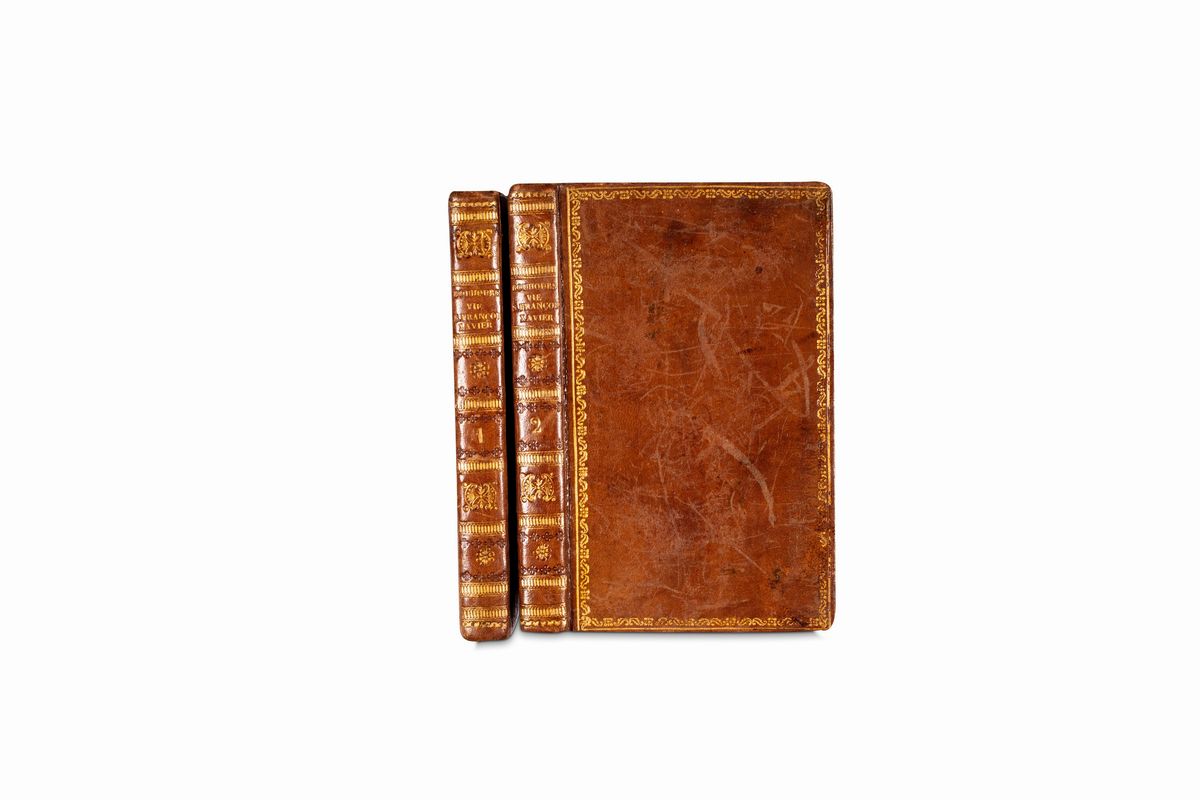 Florence, Ciardetti, 1831-32. In 8th. 5 books in 4 vols. Slight blooms, paper patch applied to the title pages, coeval binding in half leather and marbled paper, author and title stamped in gold on the smooth spine with gilded decorations, slight defects. § Together in the lot & nbsp; P. Boubours , La Vie de S. Francois Xavier apotre des Indes et du Japon , Paris, Bureau de la Bibliotheque Catholique, 1825. 2 vols. Slight blooms, coeval full leather binding, plates framed by gilded frame, author and title stamped in gold on the spine with friezes, very slight defects. Signature of belonging to the guard card. & Nbsp;