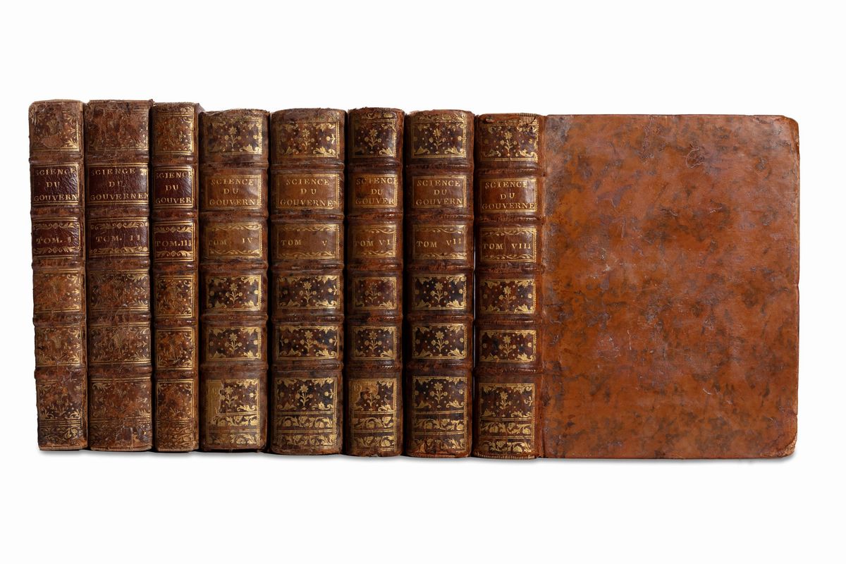 The Hague, s.e., s.d. [Paris and then Amsterdam, various publishers, 1761-1765]. In 4th. 8 vols. With a large folded portrait of the author, woodcut frieze on the title page, light browning, slightly more intense on some files, light blooms and scattered redness, coeval binding in marbled calfskin, title and tome imprinted in gold on the back with 5 nerves with friezes, red cuts, some small lacks on the backs, slight defects. Paper ex libris for counterplates.