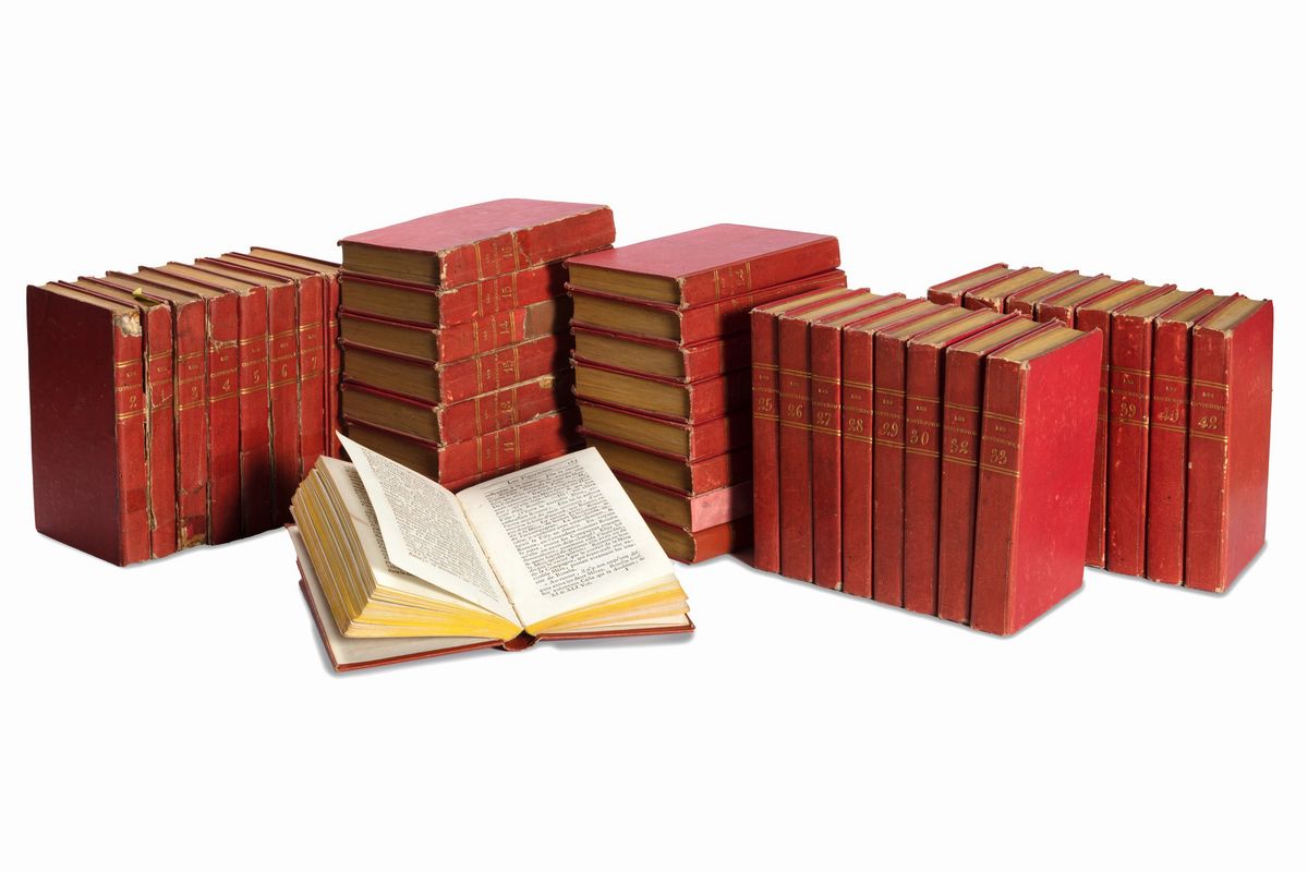 Leipzig, Buschel; Paris, Belin (later Duchesne), 1780-1785. In 12 °, 41 vols. (of 42: no. 31 is missing). With 275 out-of-text plates by Binet and his school, slight browning and blooms, coeval binding in red cardboard, title and tome number imprinted in gold on the spine, a detached spine, some defects and lacks in the backs, slight defects. In the counterplate paper ex libris Tammaro De Marinis.