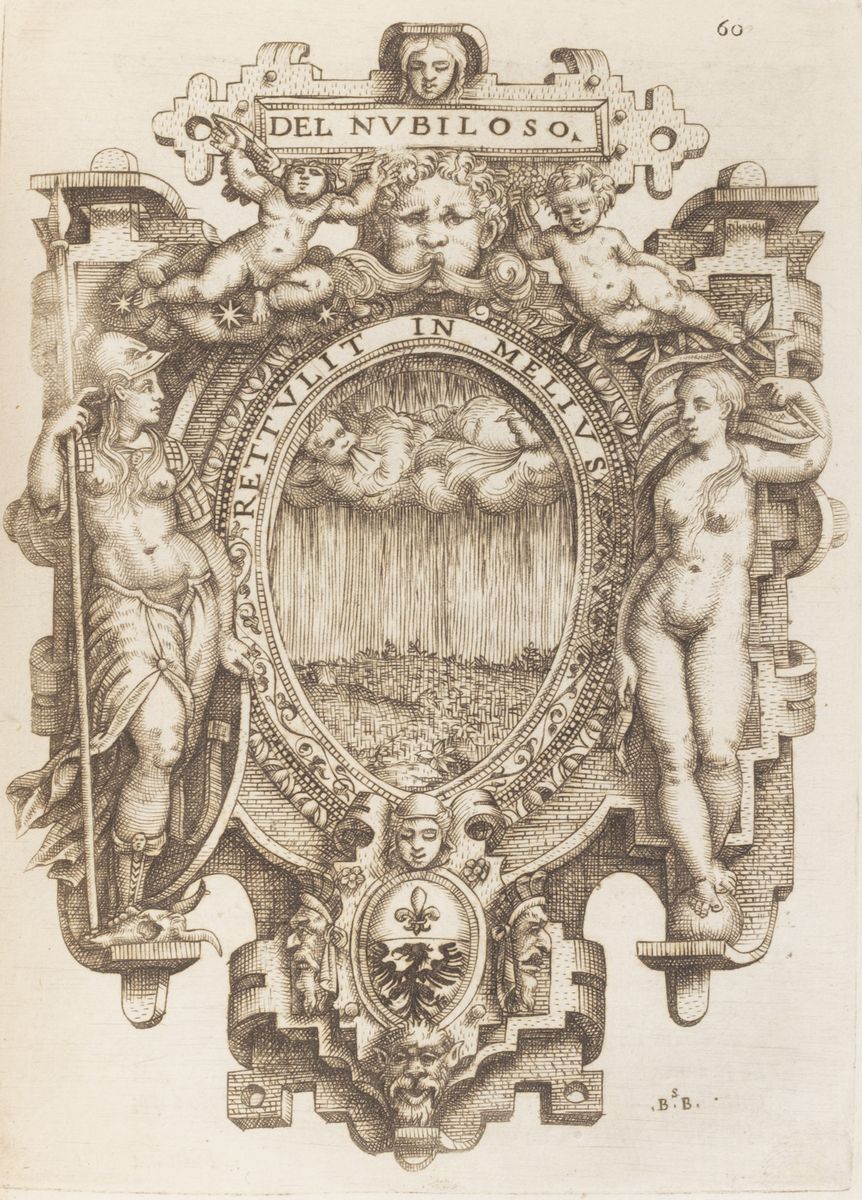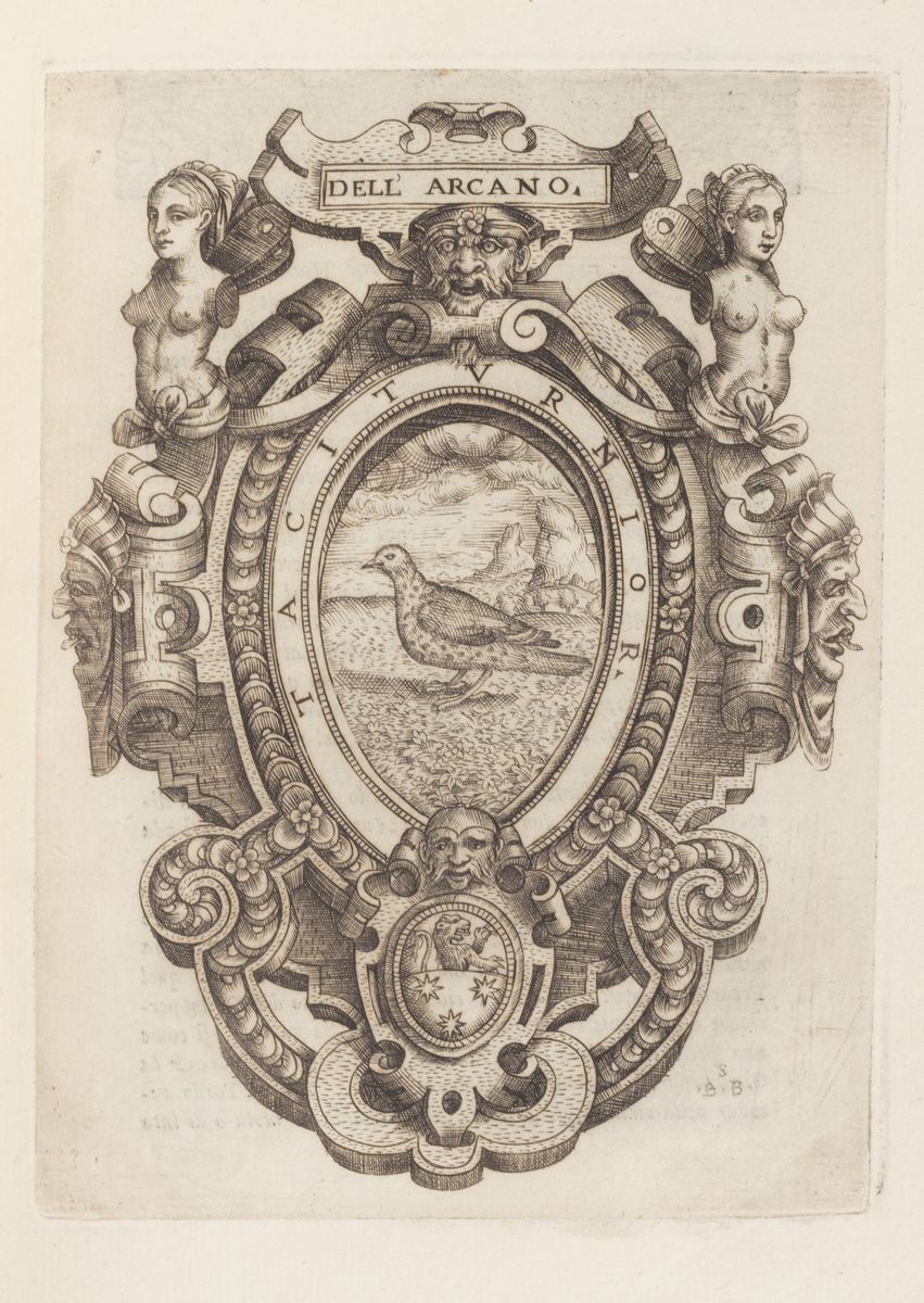 Brescia, Vincenzo Sabbio, 1568. In 4th. Allegorical frontispiece of an architectural layout where the Academy's enterprise stands out: the "Silenus informed by the motto Intus Non Extra" by Bartolomeo from Brescia, dedicated to Mrs. Barbara Calina by the Secretary of the Academy, 15 enterprises of the various academicians engraved in copper full page, light halos, light speckles, half leather binding, from the 16th century. XIX, on the smooth spine a black label with title, friezes impressed in gold.