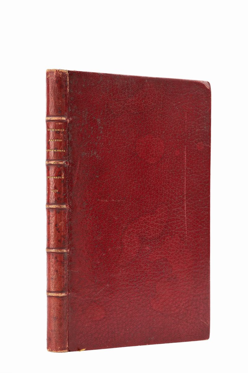 Antwerp, Christophe Plantin, s.d.ma1571 . In 8th. 2 parts in one volume. Collation A-I8, K4 a-b8 c4. Elegant architecturally illustrated frontispiece, full-page medallion of Christ, 62 plates depicting biblical scenes after Pieter van der Borcht and van den Broeck by A. de Bruyn, P. Huys, H. Wiericx, inkblot on p. F5, binding in red morocco, spine with author and 5 raised bands, with author, title and date embossed in gold, gilt edges, slight stains on plates.
