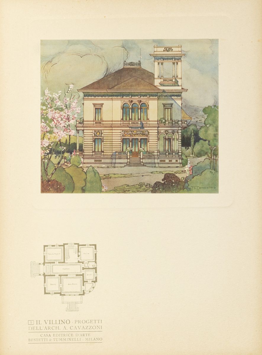 Milan, Bestetti & Tumminelli, n.d. (but 1910 ca.) In folio, title page and 30 loose plates, (each with the topographical plan below and the view of a villa above), taken from watercolors by A. in chromolithograph applied on the cardboard, minor defects, editorial folder in cloth with closing strings, title in gold on the spine and on the plate.