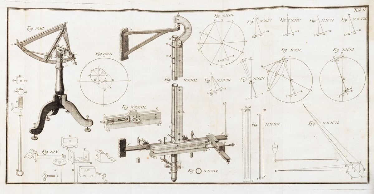 First and only edition. A scientist known for his important research on electrostatics, also testified by a close correspondence with Benjamin Franklin and on operational geodesy, Beccaria was the main proponent of the scientific renewal of the University of Turin. In 1759 he was commissioned by King Carlo Emanuele III, an admirer of science and a great patron, to measure the arc of the Piedmontese meridian, the so-called Gradus Taurinensis in order to also calculate the equatorial circumference and update the Royal geographic maps. The distinguished scientist from Monregalese (Mondovì 1716 - Turin 1781) began the remarkable geodetic enterprise in 1760, assisted by his collaborator Domenico Canonica which required years of laborious counting, surveying and astronomical observations. This rare and famous work, published in 1774, a full 14 years after the start of the observations, describes the entire enterprise which was later remembered with two twin geodetic obelisks: one placed in Turin in Piazza Statuto called «Guglia Beccaria» and the another in Rivoli at the end of Corso Francia.