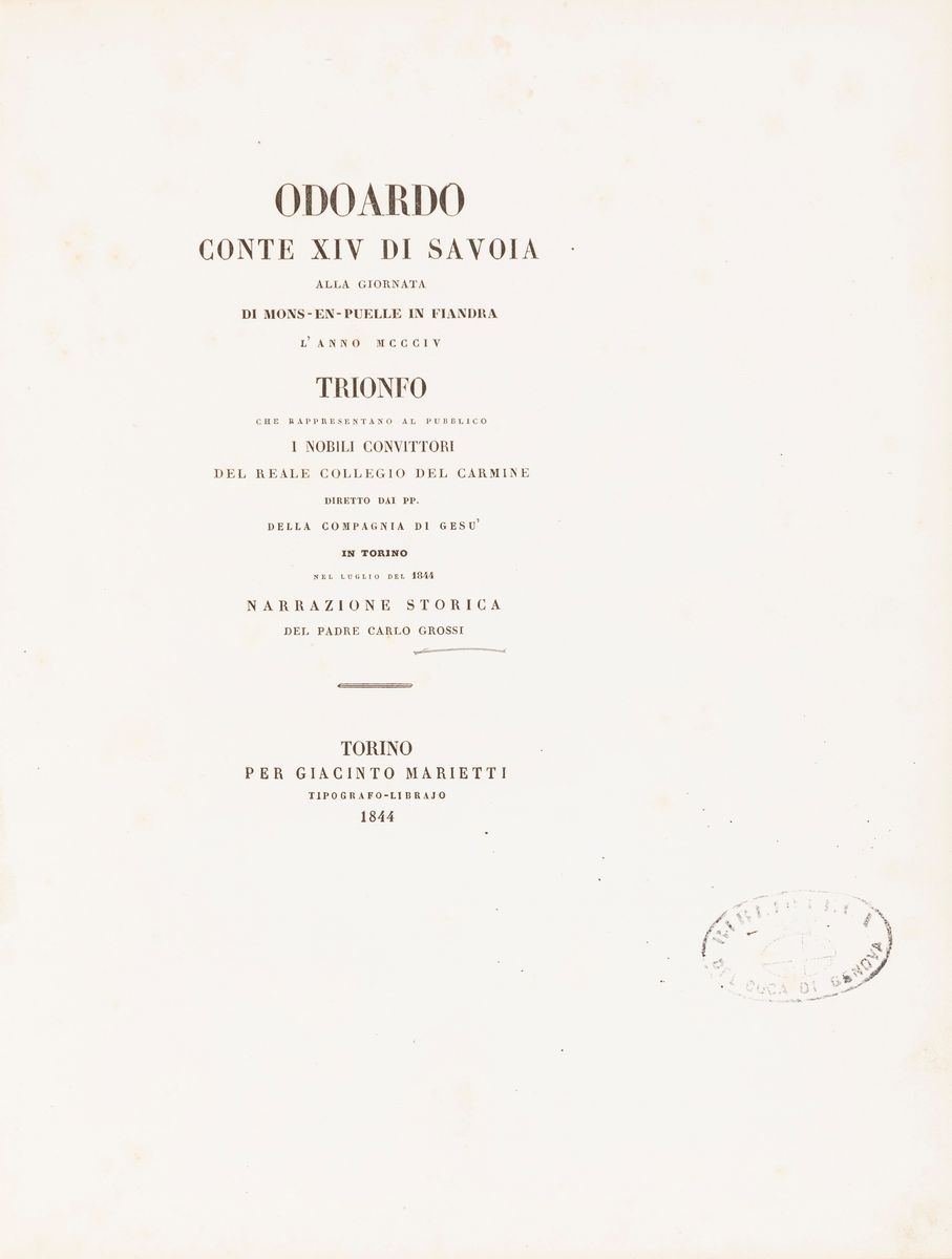 Odoardo Conte XIV of Savoy ... Triumph representing the noble boarders of the Royal College of Carmine to the public ... historical narration by Father Carlo Grossi, 1844