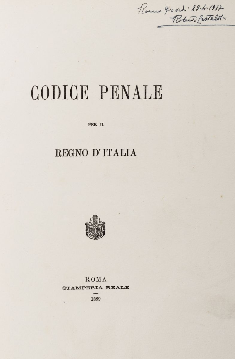 Beautiful edition, limited edition, printed on large paper. The Zanardelli penal code, named after the Minister of Justice who promoted its adoption, issued by royal decree on 30 June 1889, it was in force from 1890 to 1930. With this code, capital punishment was then abolished throughout Italy, while most European countries still resorted to it.
